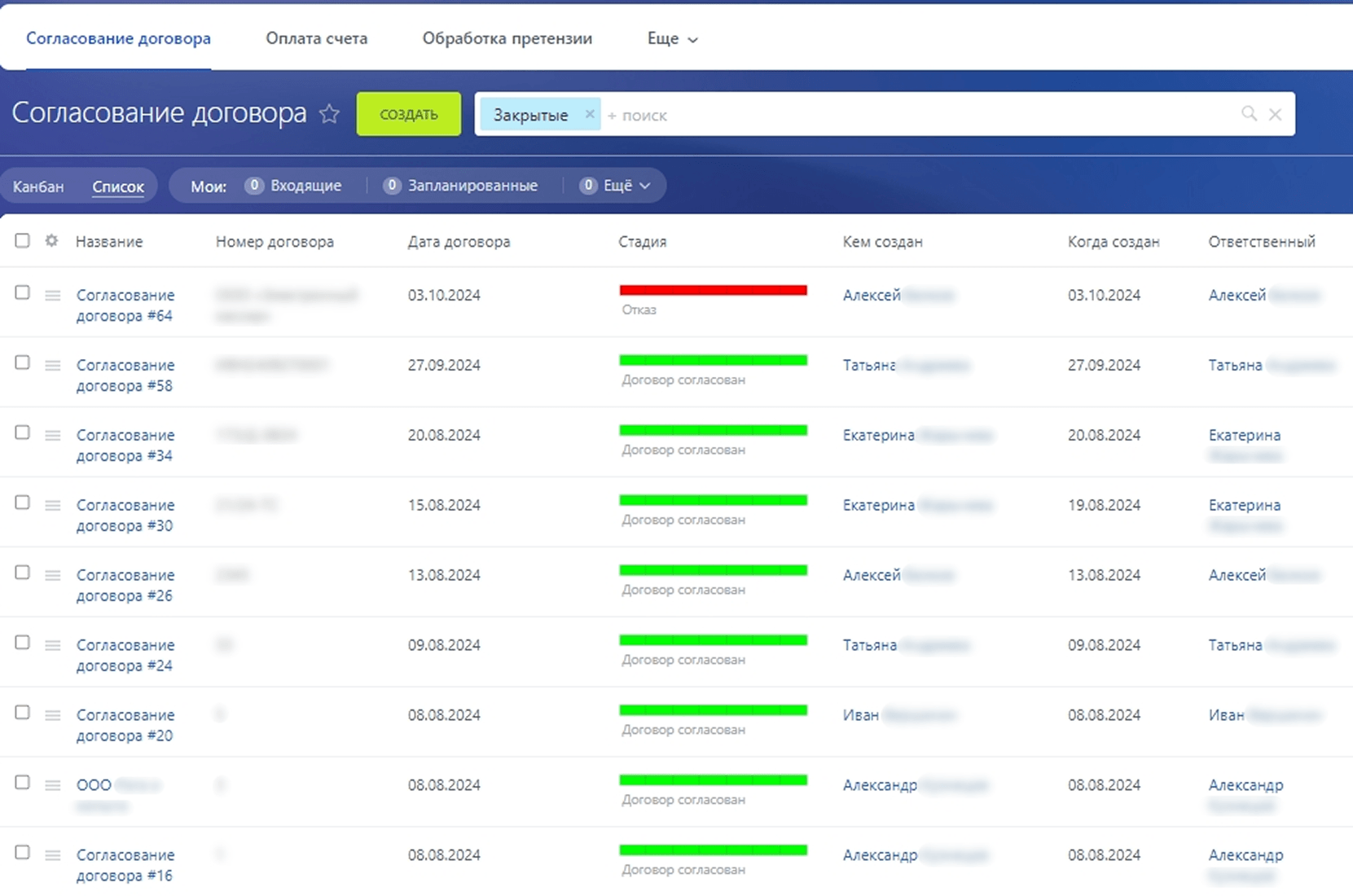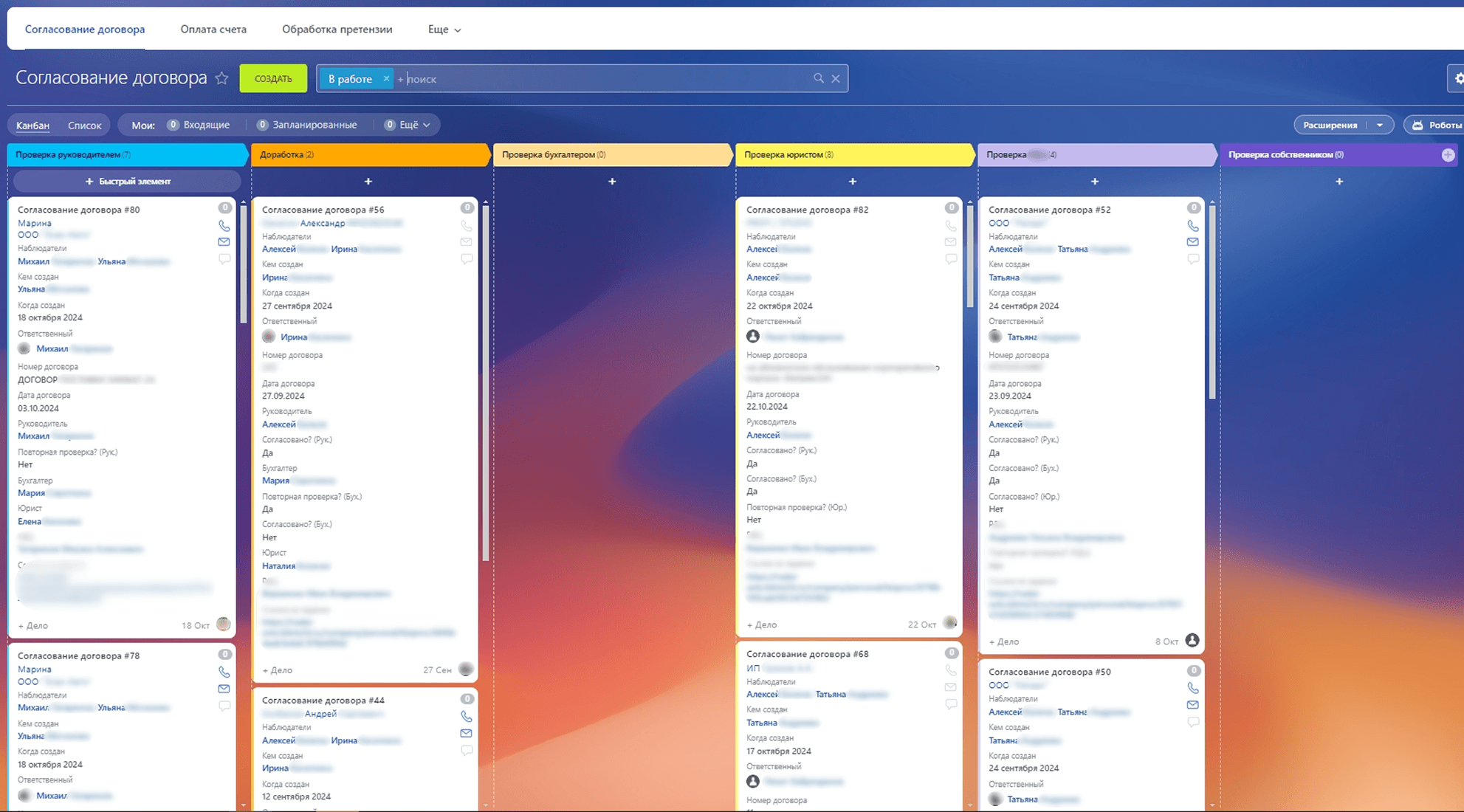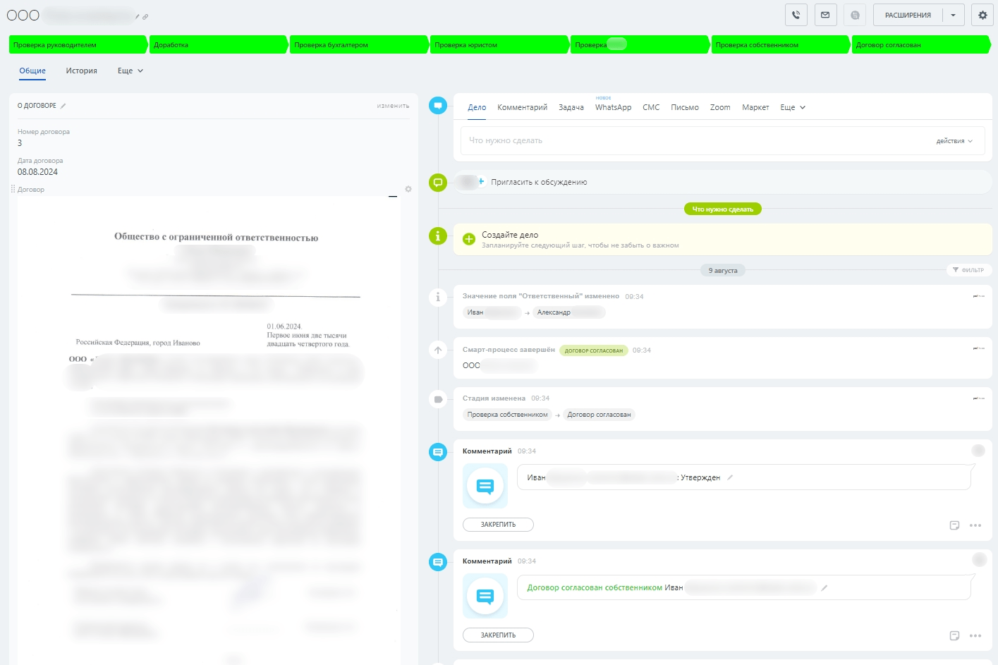 В системе была создана воронка согласования договоров с четко определенными этапами и статусами.