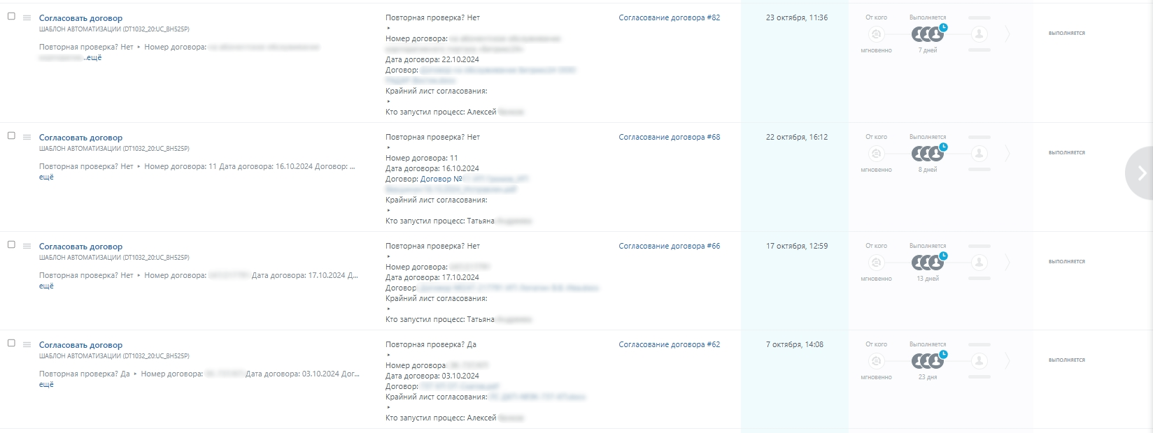 Это позволяет быстро находить нужную информацию по договору и понимать, как проходило его согласование.