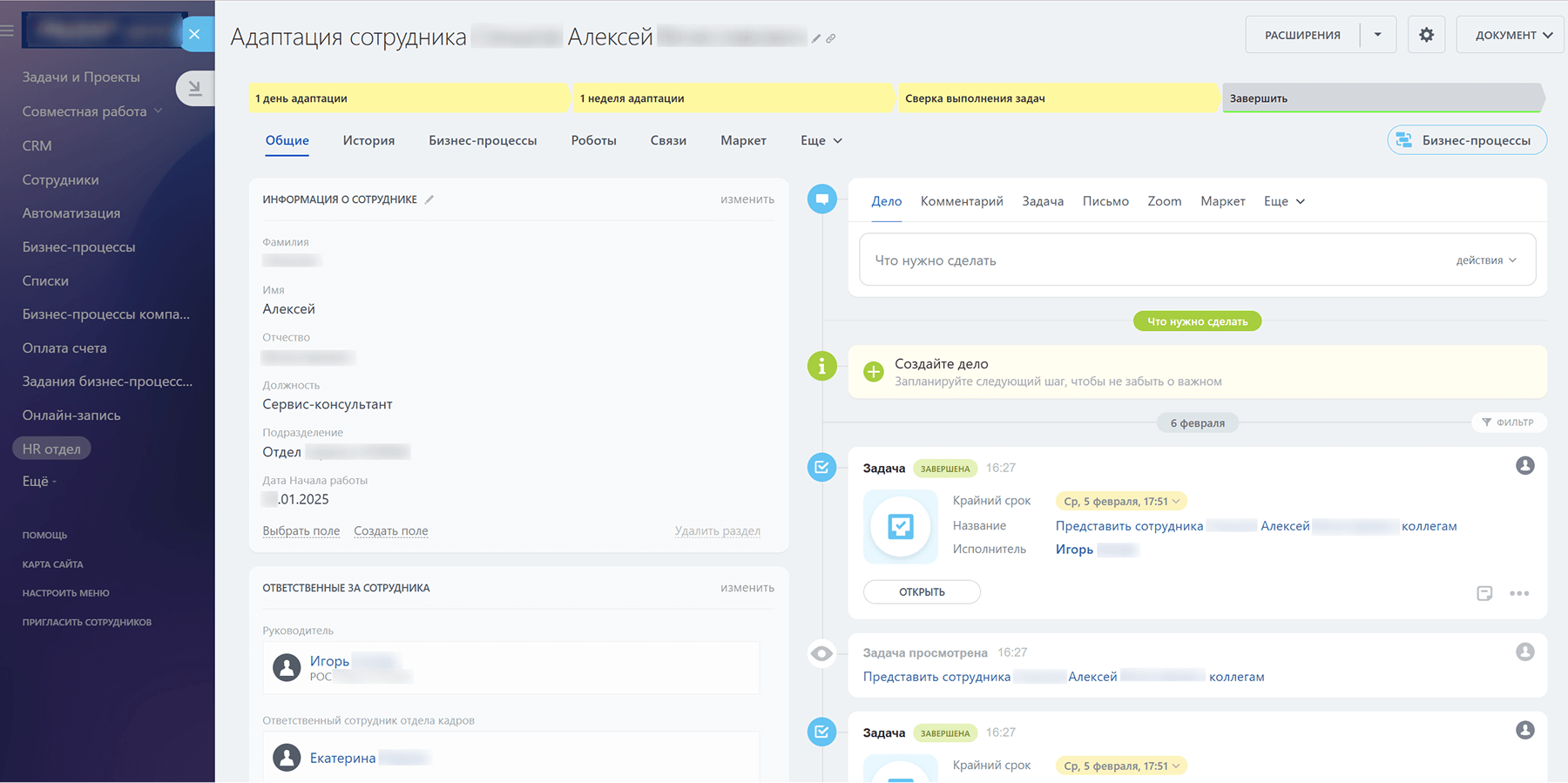 Настроили ведение карточки адаптации сотрудника по воронке – от первого дня адаптации до успешного окончания.