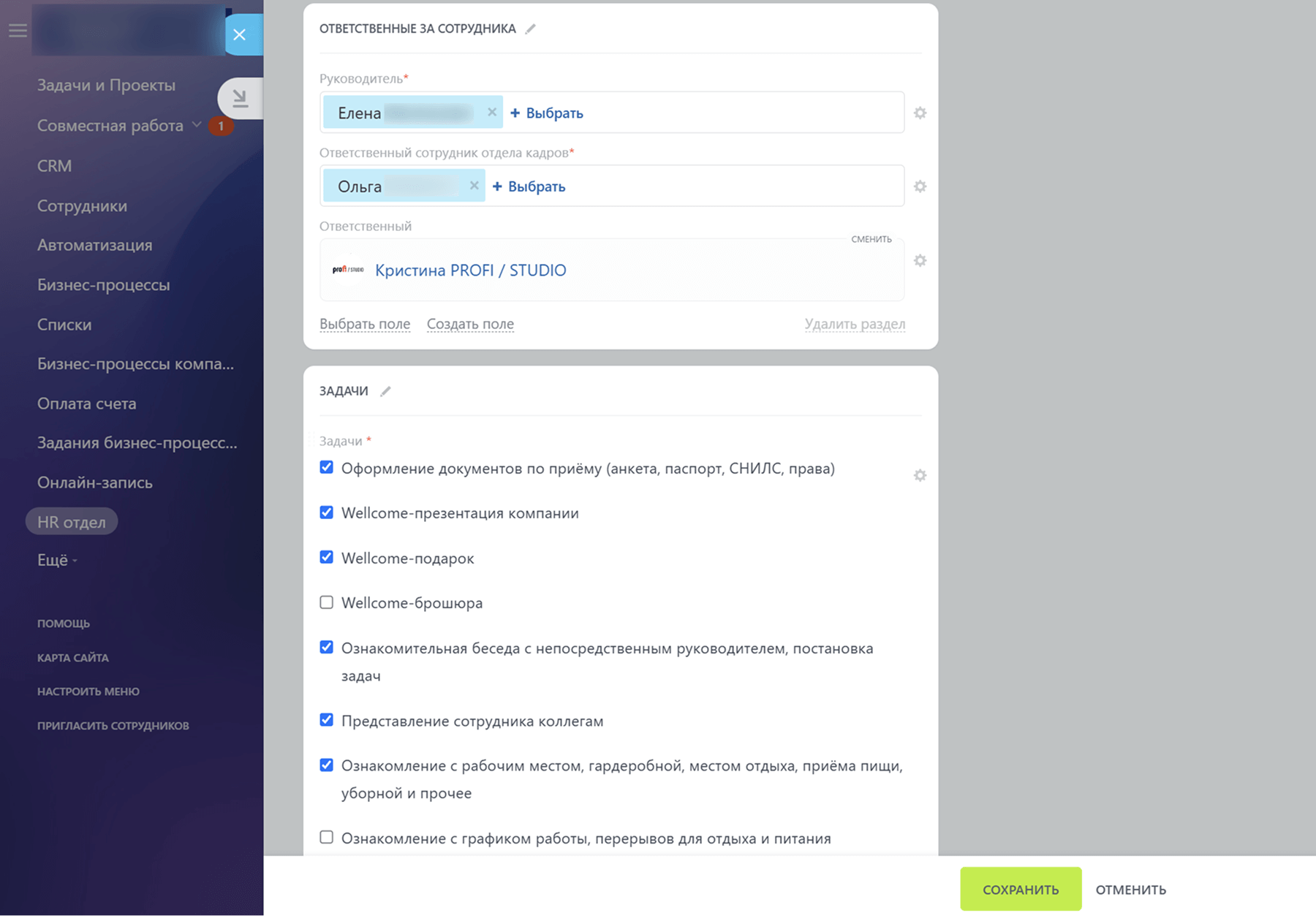 HR может выбрать прям из карточки какие именно задачи по адаптациии должны будут поставиться автоматически.