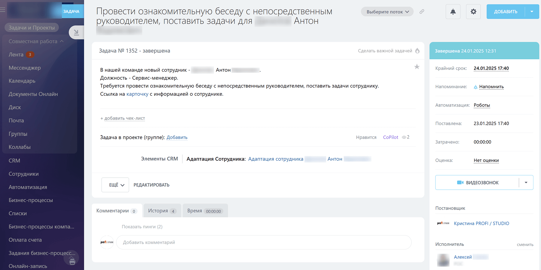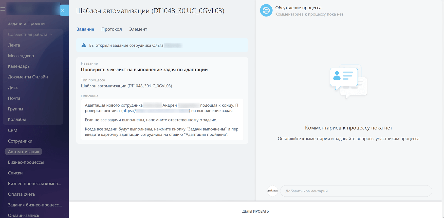 Также настроена автоматическая генерация чек-листа по завершении этапов адаптации, который отражает, кто из сотрудников выполнил задачи, а кто еще не завершил.
