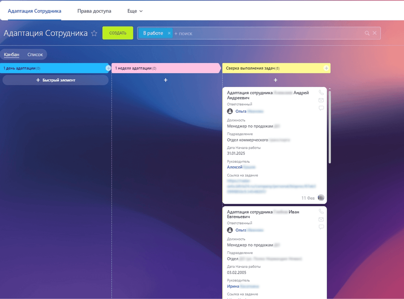 ✔ Все карточки новых сотрудников объединены в одном месте — это позволяет отслеживать этап адаптации в режиме реального времени.