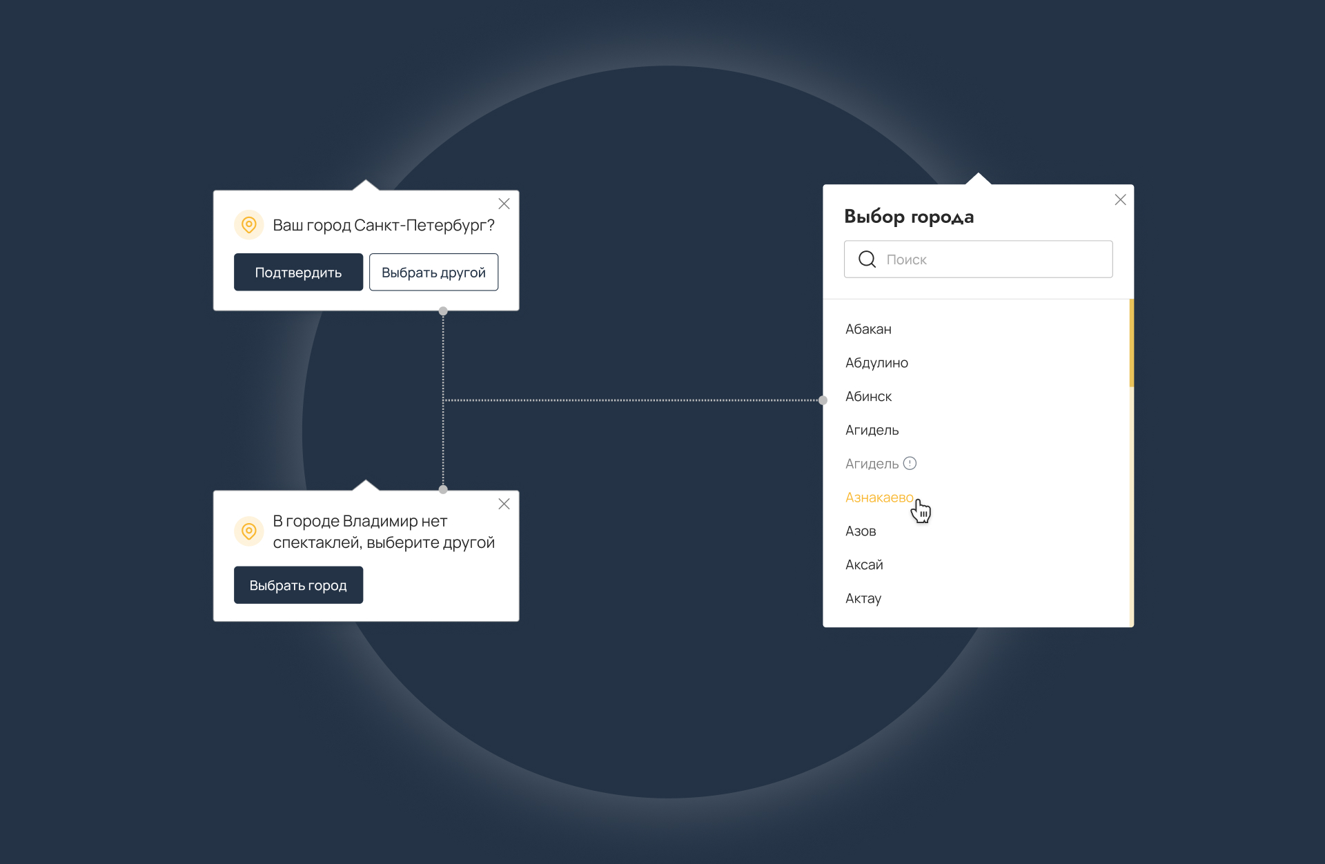 Выбранные города отображаются сверху в виде наглядных тегов: их легко проверить, убрать или заменить в пару кликов.