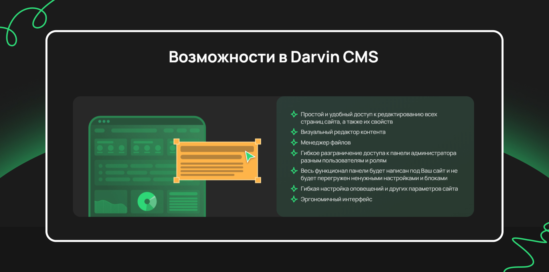 Работали на Darvin CMS – это кастомная система, с которой работает команда агентства. Именно она позволила нам реализовать замысел клиента.