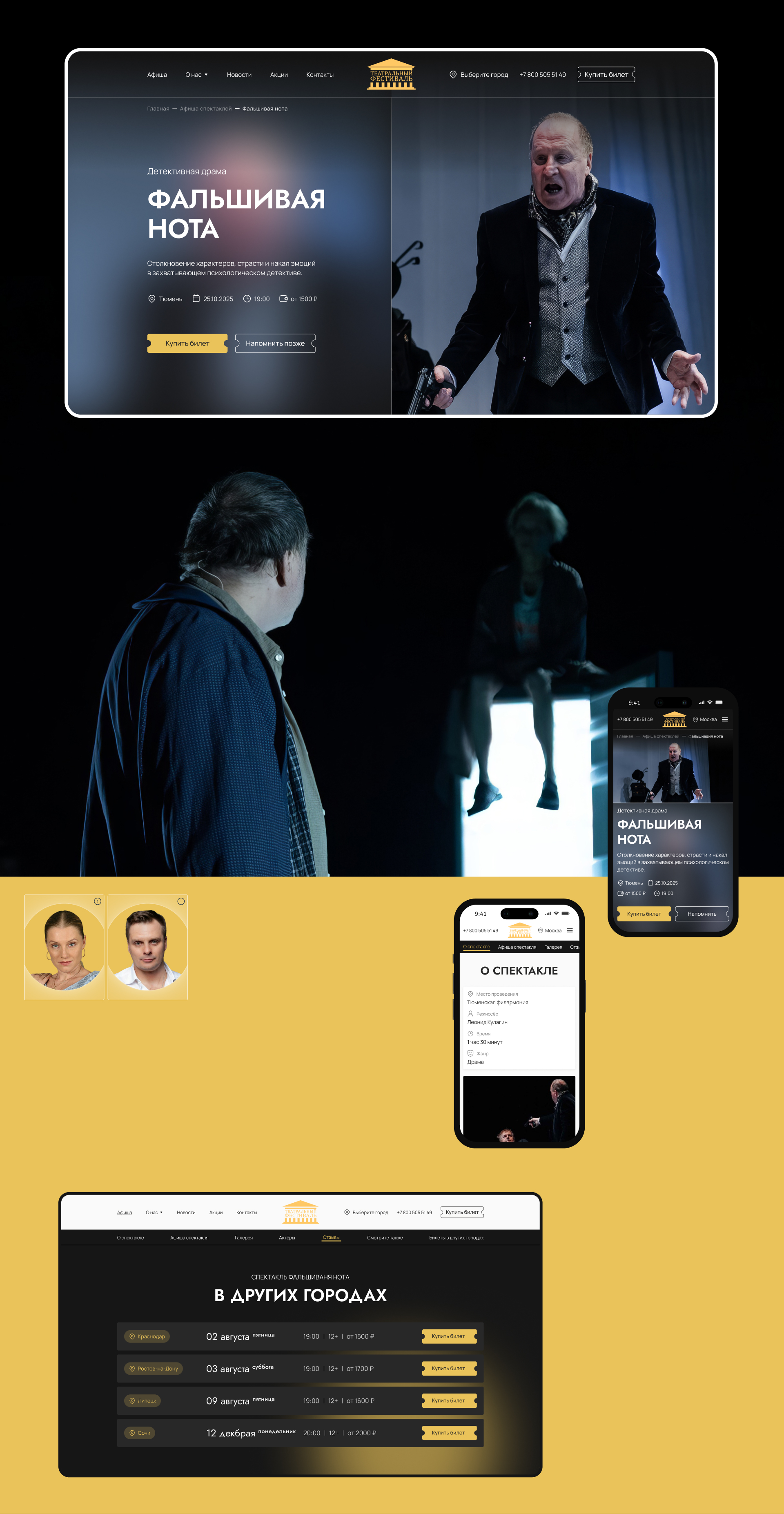 Главная идея этого дизайна – с первых секунд погружать пользователя в атмосферу театра. Поэтому на первом экране крупные портреты артистов, направленный свет, словно прожектор на сцене, и выверенная композиция. Центр в фокусе – именно туда попадает взгляд, именно там размещены ключевые блоки.