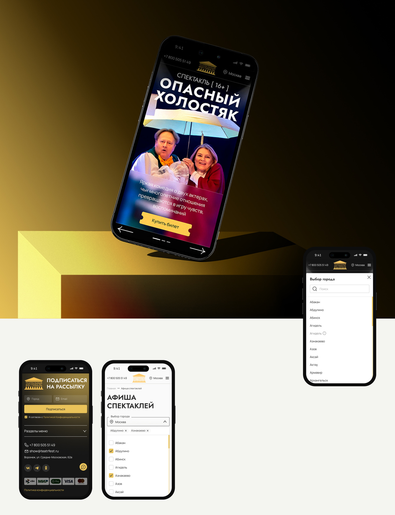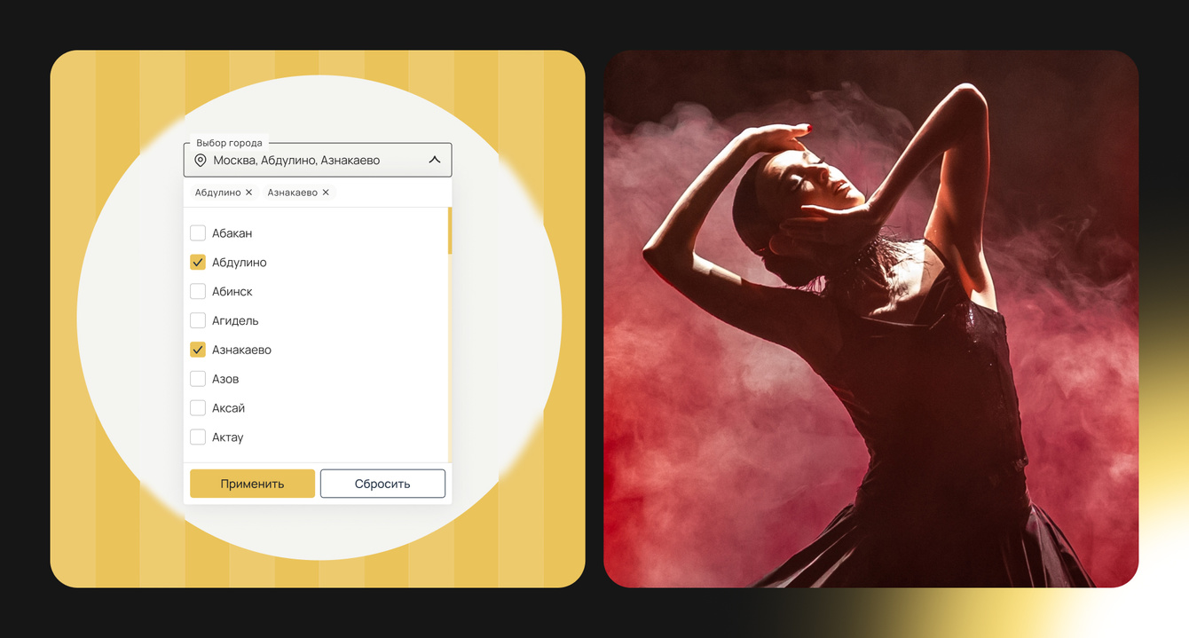 В афише мы сделали акцент на удобный и гибкий поиск. Пользователь может отфильтровать спектакли сразу по нескольким городам – это особенно важно, если он следит за событиями в разных регионах или планирует поездку.