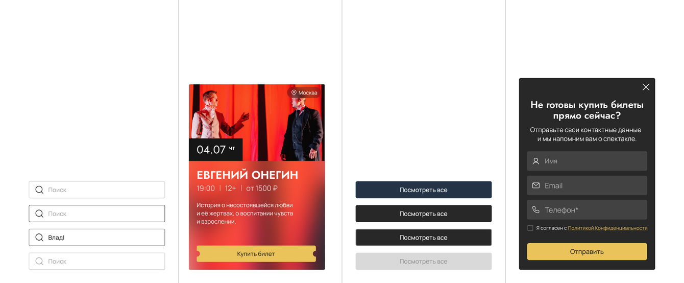 Из этого выросли уже прикладные компоненты: кнопки, карточки спектаклей, блоки фильтрации, секции страниц. Все компоненты собираны в единой логике. Это не только поддерживает визуальное единство, но и делает проект удобным для масштабирования в будущем.