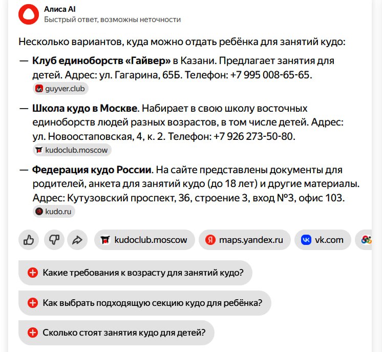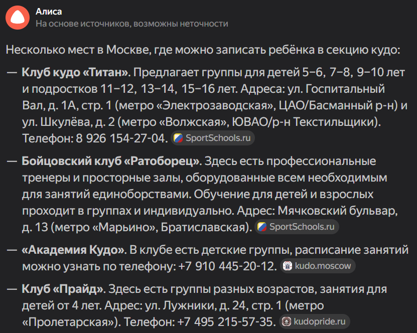 Мы собрали список источников, которые Алиса/Яндекс используют для ответа на запросы про секции кудо: