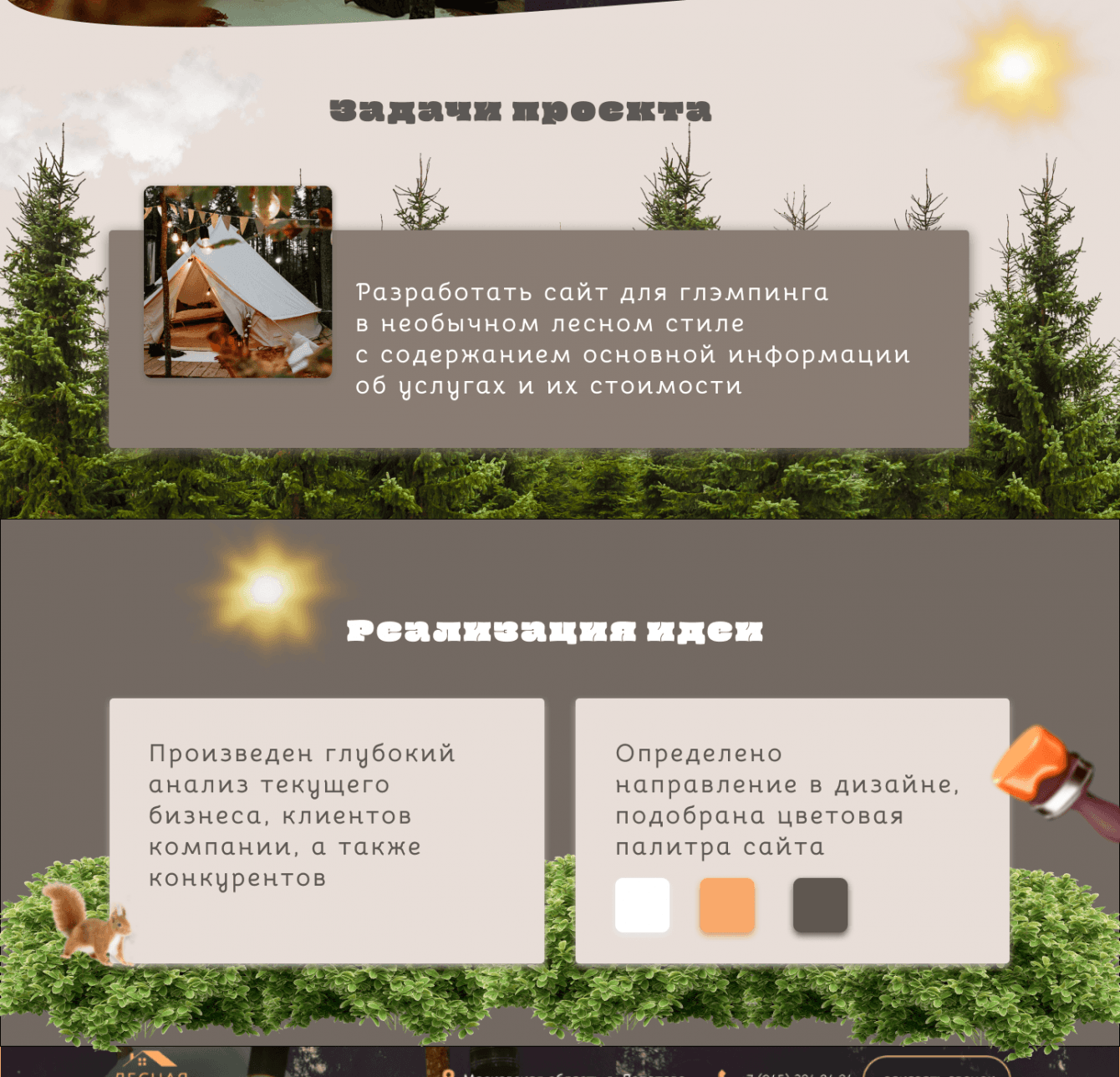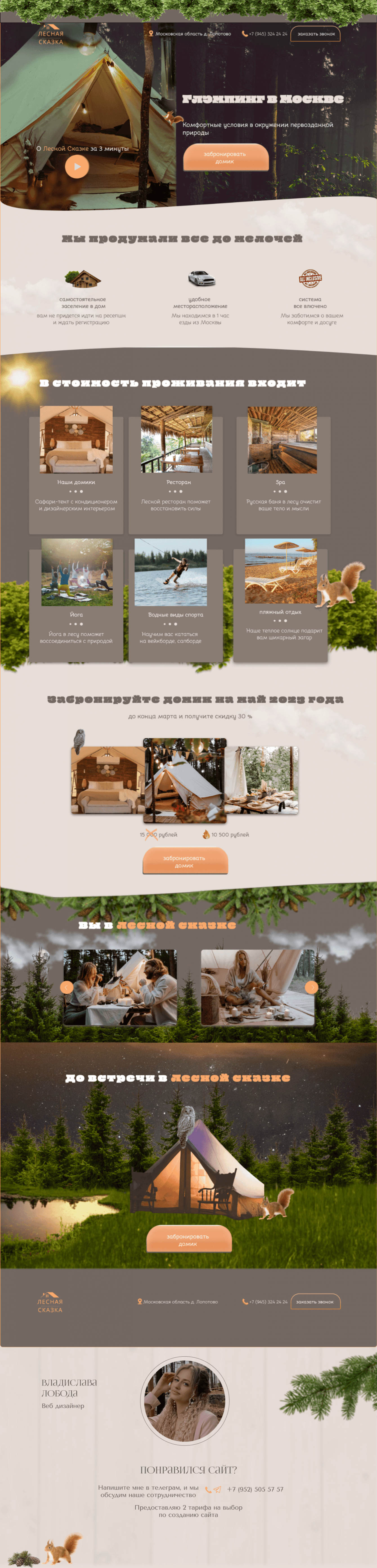 Разработать сайт для глэмпинга в необычном лесном стиле с содержанием основной информации об услугах и их стоимости