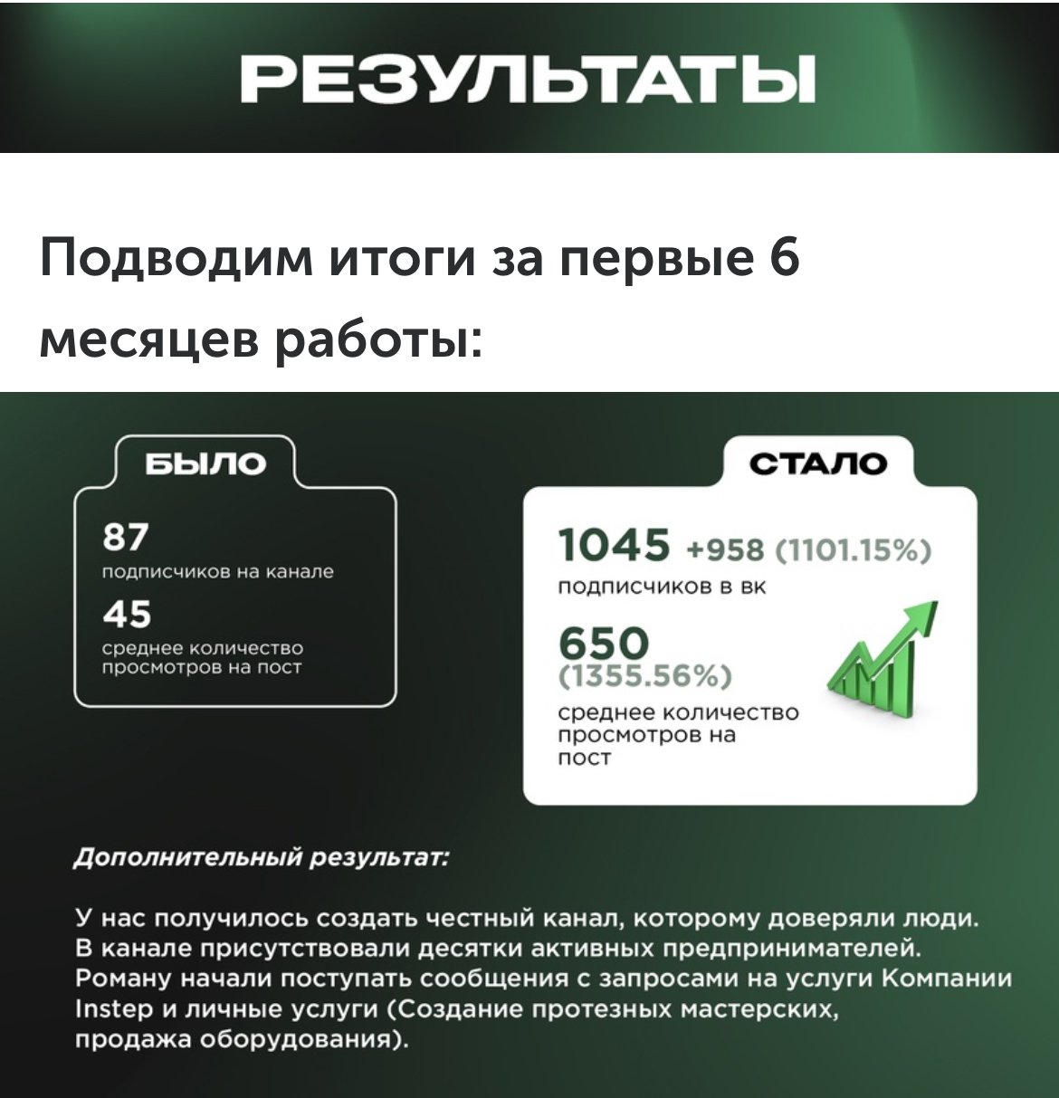 У нас получилось создать честный канал, которому доверяли люди. В канале присутствовали десятки активных предпринимателей. Роману начали поступать сообщения с запросами на услуги Компании Instep и личные услуги (Создание протезных мастерских, продажа оборудования).
