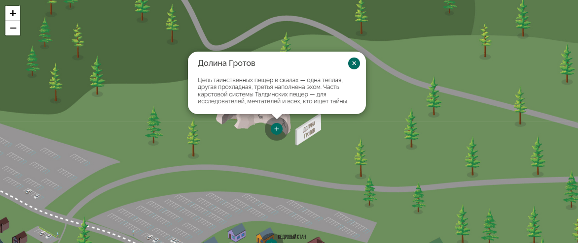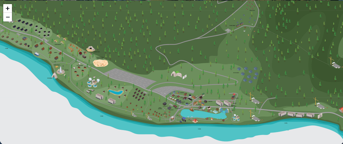 По договорам с резидентами, планами местности ОЭЗ и Яндекс Картами, нами была нарисована своя интерактивная карта резидентов особой экономической зоны Бирюзовая Катунь. Были нарезаны картинки в разных масштабах, размечены точки и добавлен JSON с описанием для каждой точки.