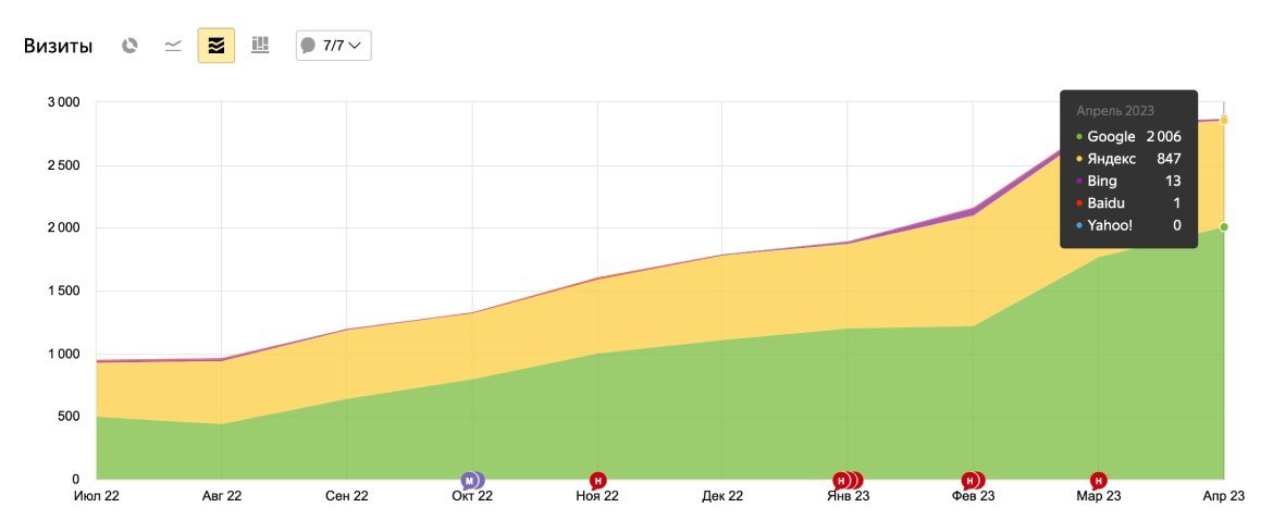 Показан график роста трафика с 1.07.2022 по 30.04.2023 года из Яндекс.Метрики.