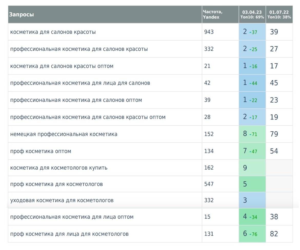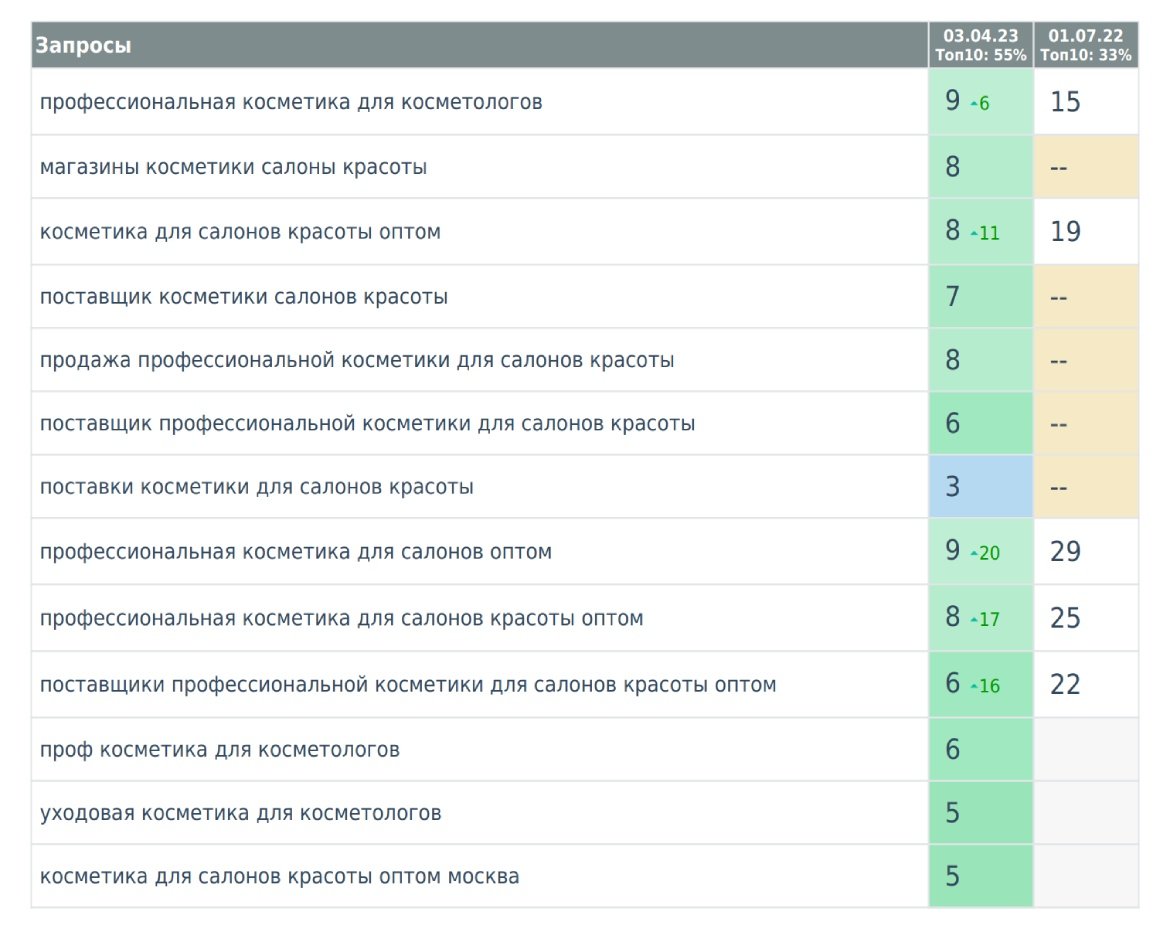 Вывели в ТОП-10 поисковых систем B2B-запросы, связанные с оптовыми поставками косметики для салонов красоты и косметологов. На скриншоте отображены позиции сайта и динамика роста фраз за 9 месяцев в Яндекс на 1 ноября 2023 года