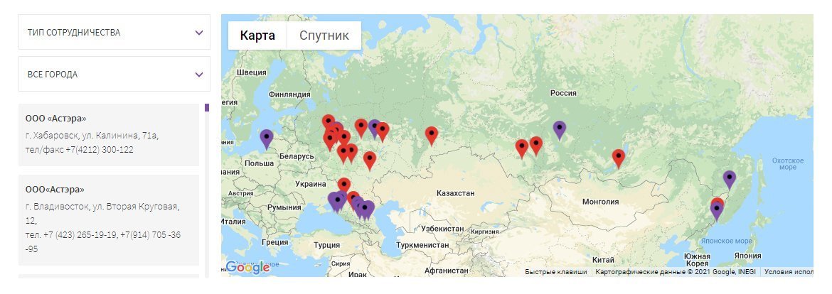 Подключили Яндекс.Карту через систему API, добавили фильтры по городу и типу партнера, которые применяются одновременно для карты и текстовых блоков с адресами. Вся информация о партнерах импортируется из 1С.