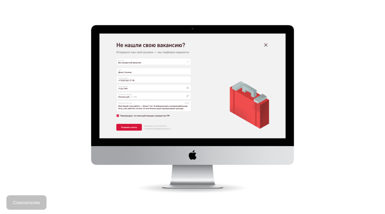В этом разделе кандидаты могут заполнить и отправить анкету или связаться по указанным контактам со специалистом по подбору персонала.