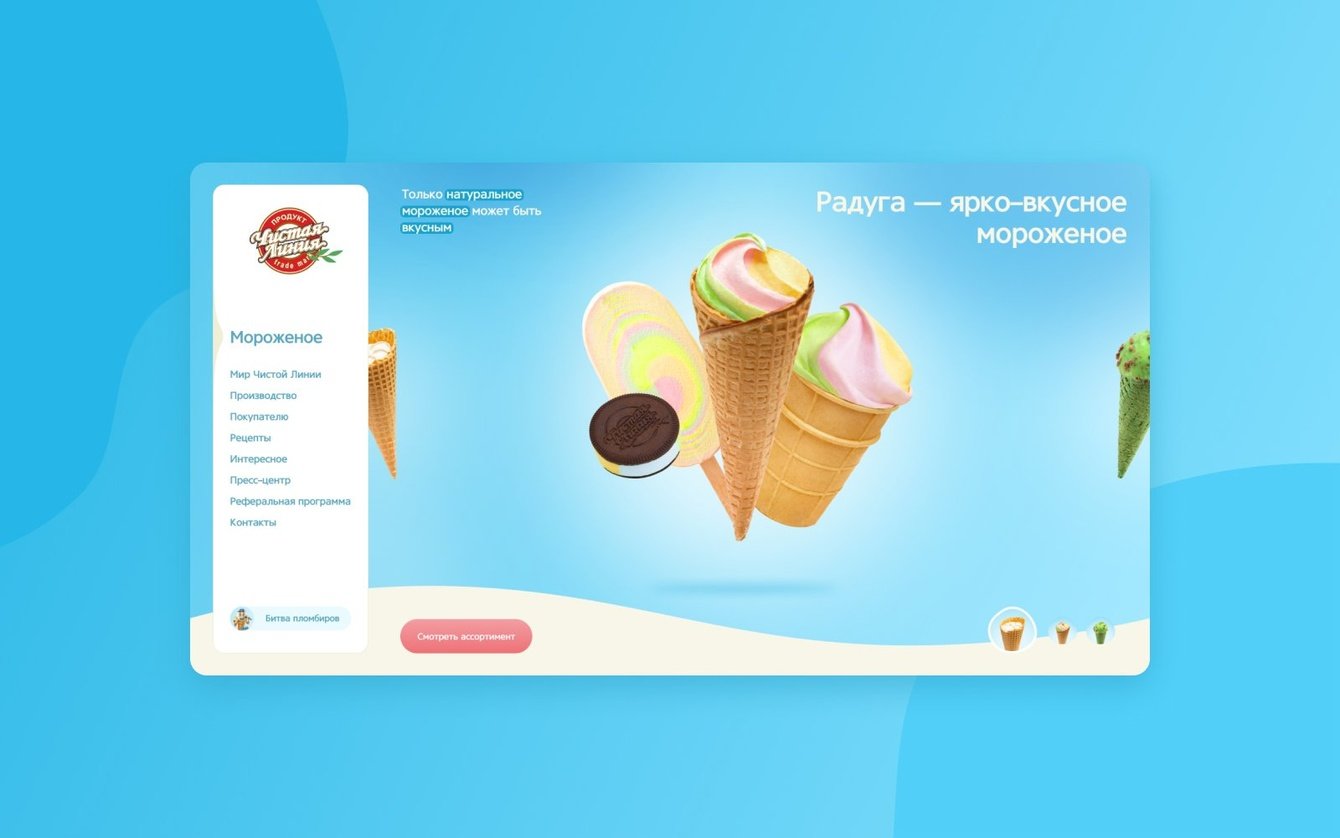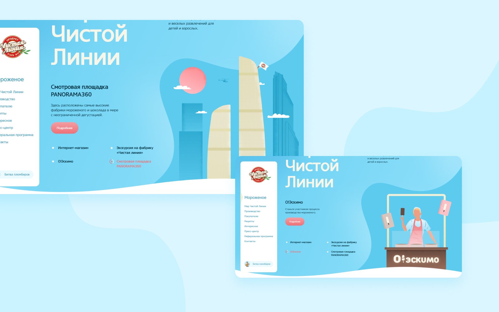 Основной визуальный язык — иллюстрации. Через иллюстрации мы сохранили фирменные цвета и образ компании. Смогли объединить яркость и дружелюбность «Мир Чистой Линии», в тоже время, не забыли про мороженое и метафору молочных волн. Сюжеты для иллюстраций взяли с реальных производственных процессов: