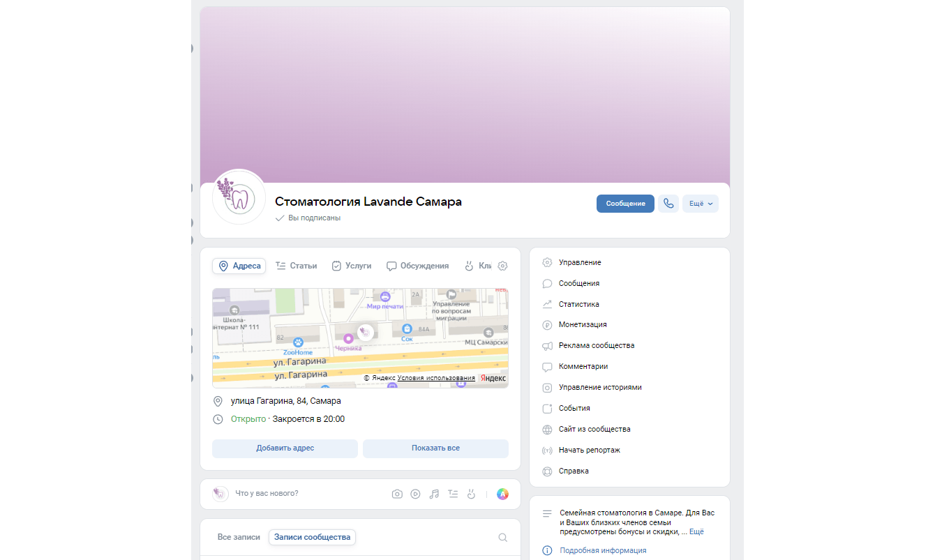 Стоматологическая клиника Lavande обратилась к нам для разработки оформления их сообщества ВКонтакте и дальнейшей его рекламы.