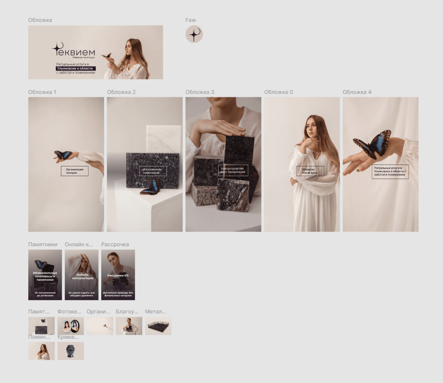 Провели встречу с клиентом, собрали бриф: изучили целевую аудиторию, основные услуги, визуальные предпочтения, конкурентов. Уточнили, какие разделы должны быть представлены в группе (памятники, ритуальные принадлежности, организация похорон и т.д.).