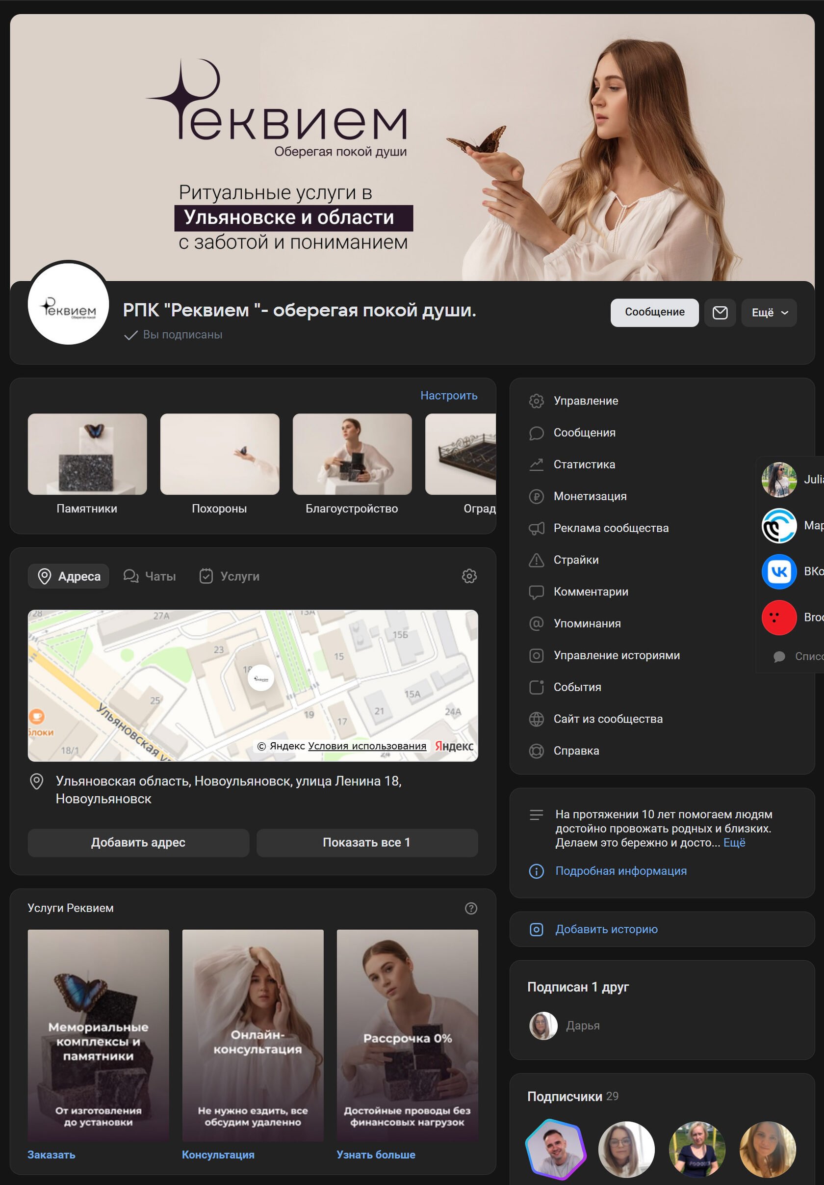 Клиент — ритуальная компания «Реквием» — обратился с запросом на полноценное оформление группы ВКонтакте в корпоративном стиле. Основные цели: