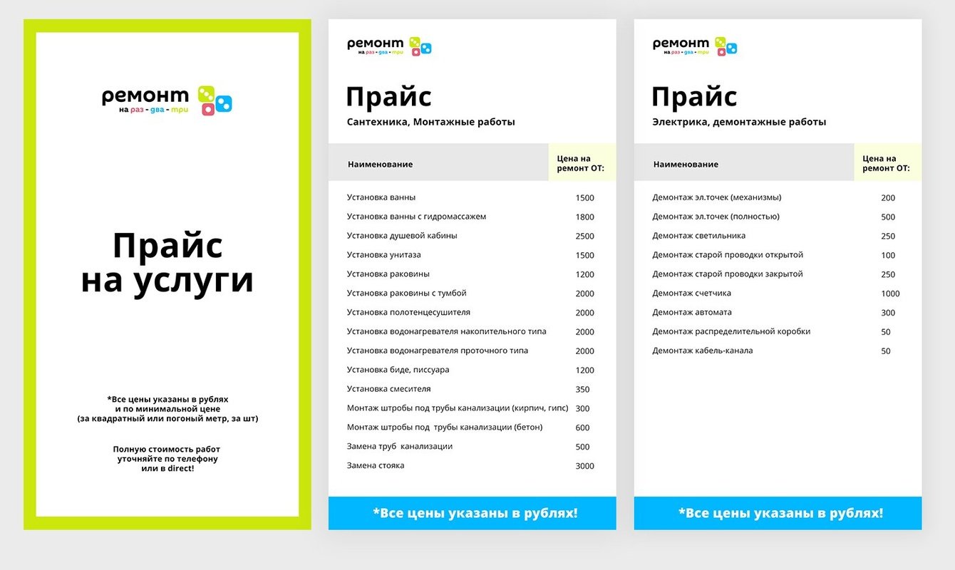 — Ребрендинг. Разработка фирменного названия, логотипа и стиля. Вариантов названия было более 10. В итоге остановились на названии remont_na_123. Оно отражает быстроту и качество работы коллектива и указывает на регион работы. Новый логотип получился одновременно привлекательным и простым.