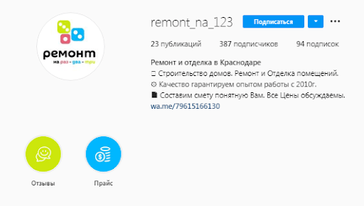 — Создание профиля в социальных сетях. Наши специалисты разработали описание для шапки профиля Instagram, оформили актуальное с отзывами клиентов и ценой услуг бригады.