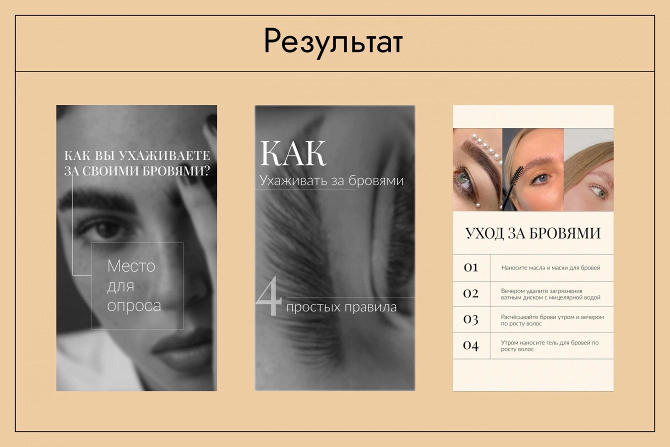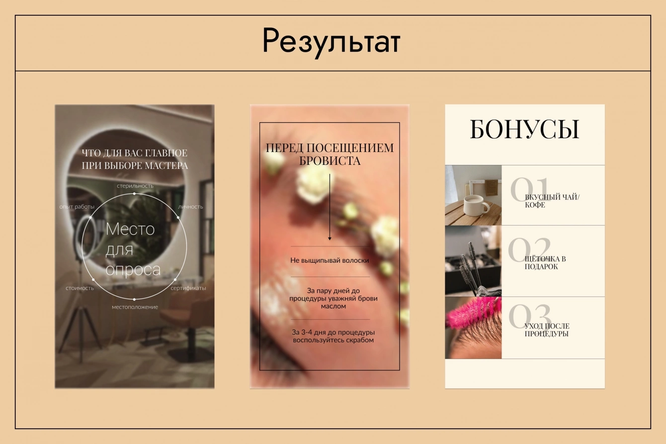 Задача: сделать красивые трендовые сторис об уходе, бонусах при посещении салона и интерактив. Сторис должны быть в нейтральных цветах, без лишних элементов