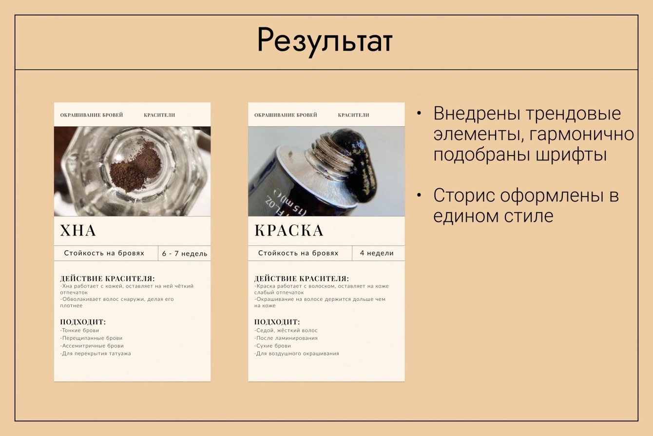 Результатом я обязана клиенту и оперативной обратной связи. Оформление сторис не заняло больше 2 недель.