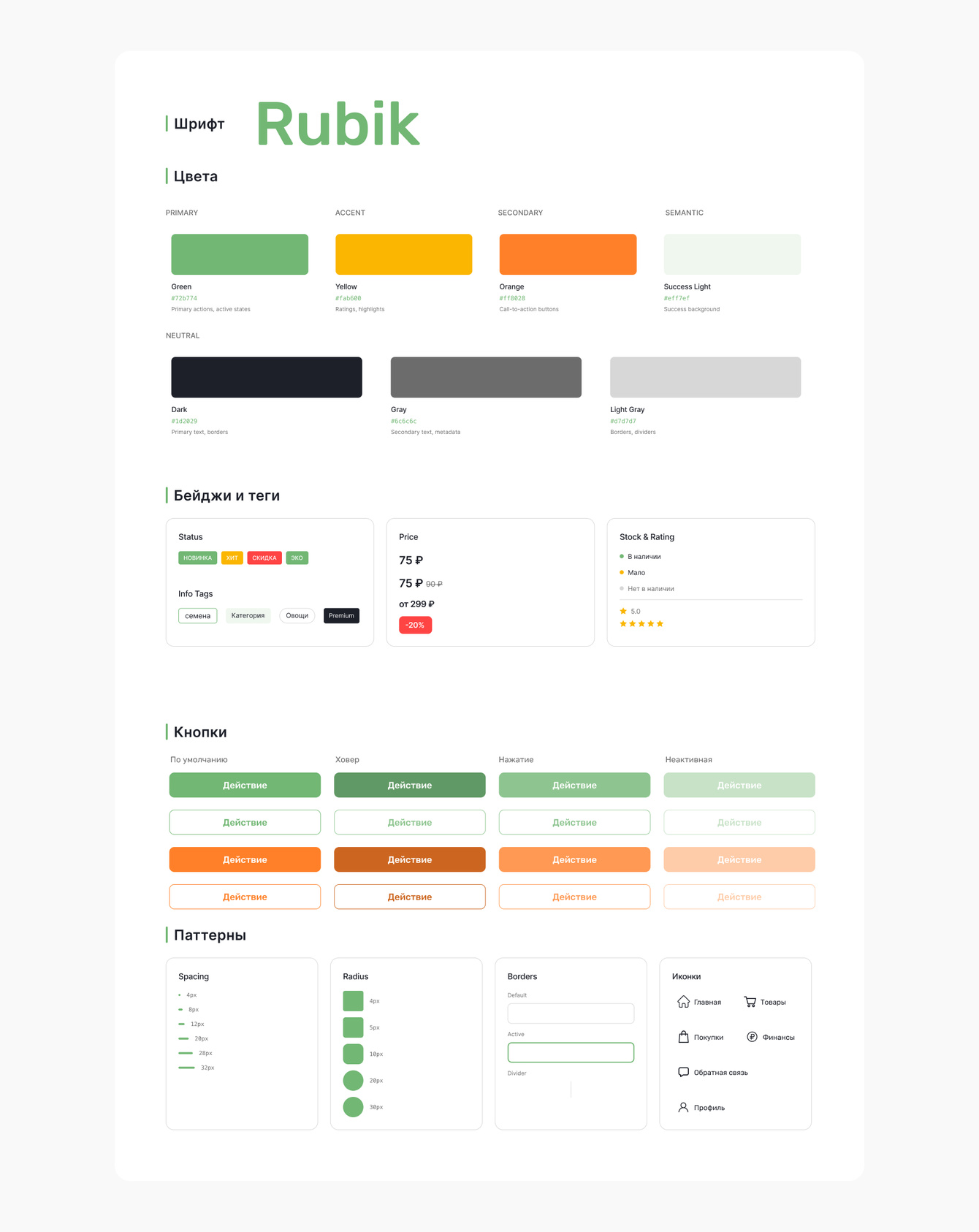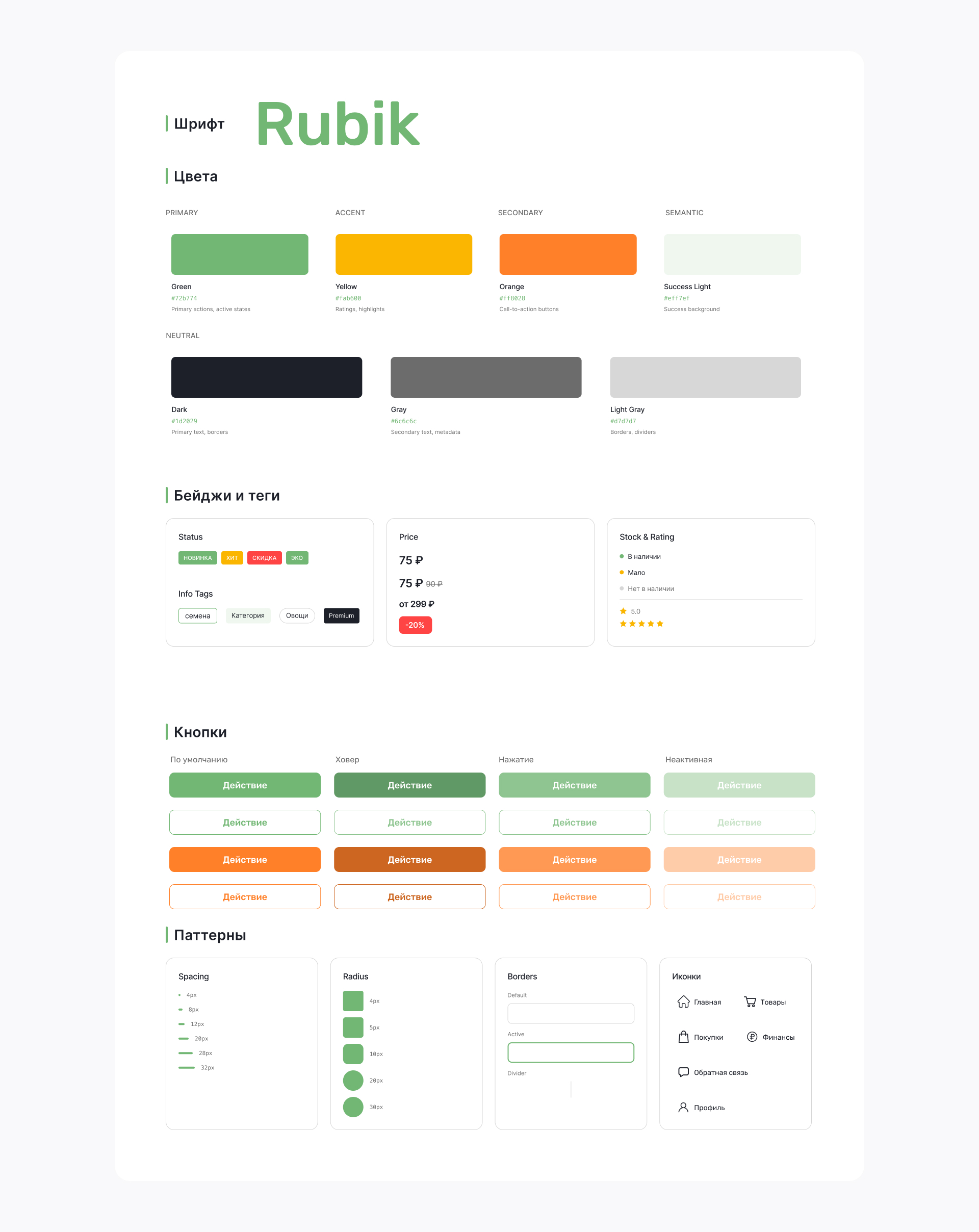 В качестве шрифта использовали Rubik — современный гротеск, хорошо адаптированный для веб-интерфейсов. Он легко читается, выглядит актуально и за счёт широкой линейки начертаний даёт достаточно возможностей для работы с визуальной иерархией текста.