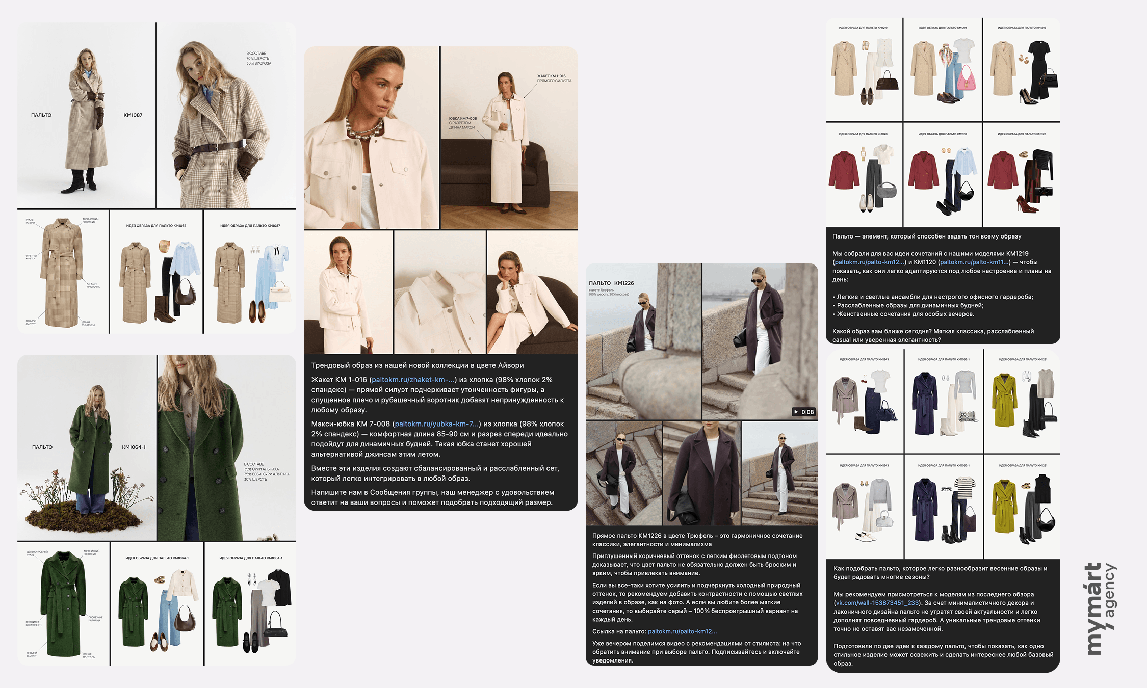 Мы начали с реализации базовых рубрик, чтобы рассказать аудитории о себе, представить бестселлеры коллекций и способы их стилизации в городской среде. А чтобы добавить пользы, увеличить лояльность и повысить охваты, реализовали рубрику со стилистом, в котором она рассказывает об удачных сочетаниях верхней одежды.