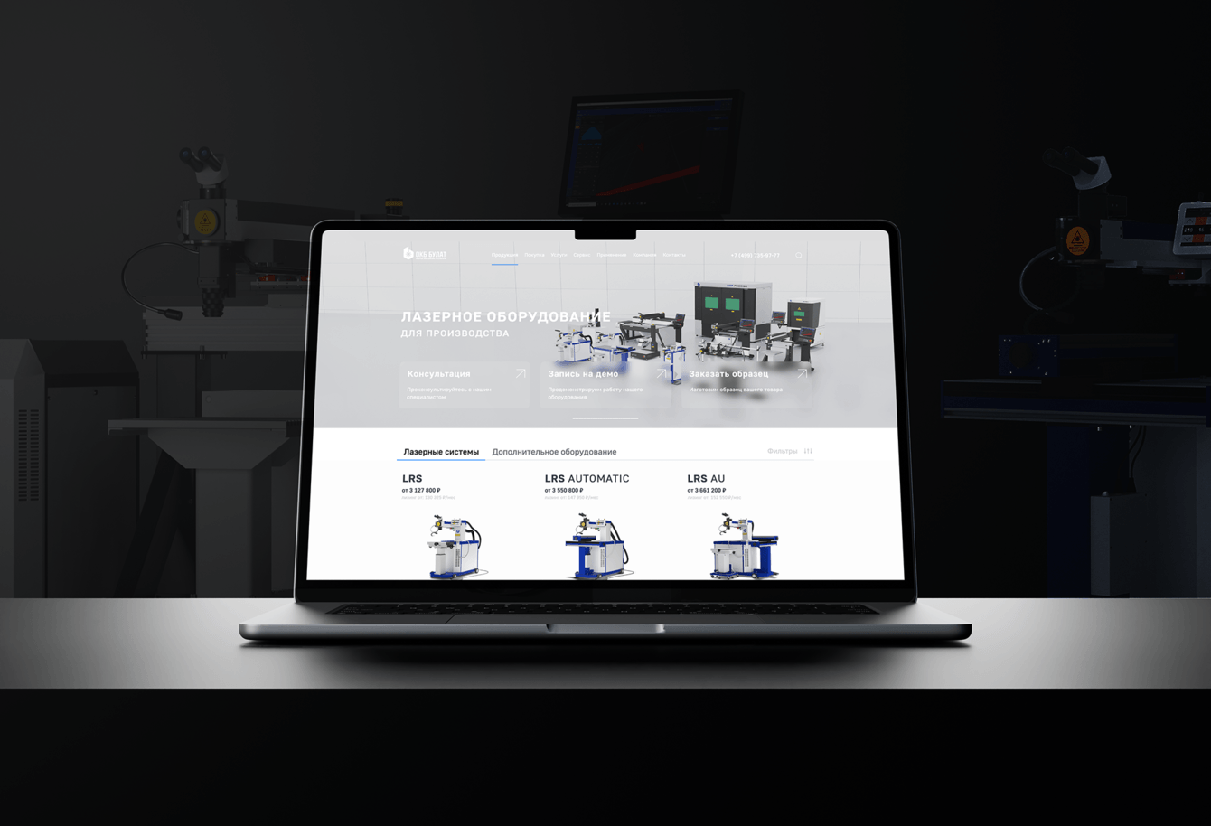 Для каждой единицы оборудования мы создали отдельный большой лендинг. На примере LRS PRO — высокоточной установки для лазерной обработки небольших деталей — видна глубина проработки. Суперсила станка — главное преимущество вынесено в заголовок. Для LRS PRO это высокая точность позиционирования (±25 мкм) и четырехосевая система для работы со сложной геометрией.