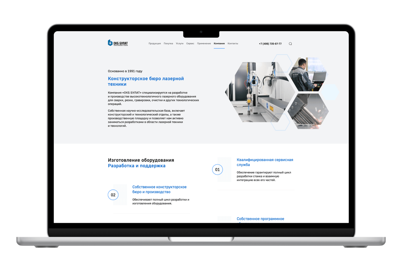 Существующий сайт не отражал масштаб и технологическое превосходство компании. Команда ОКБ «БУЛАТ» обратилась к нам за созданием современного цифрового представительства, способного презентовать передовые технологии и научно-производственный потенциал 24/7.