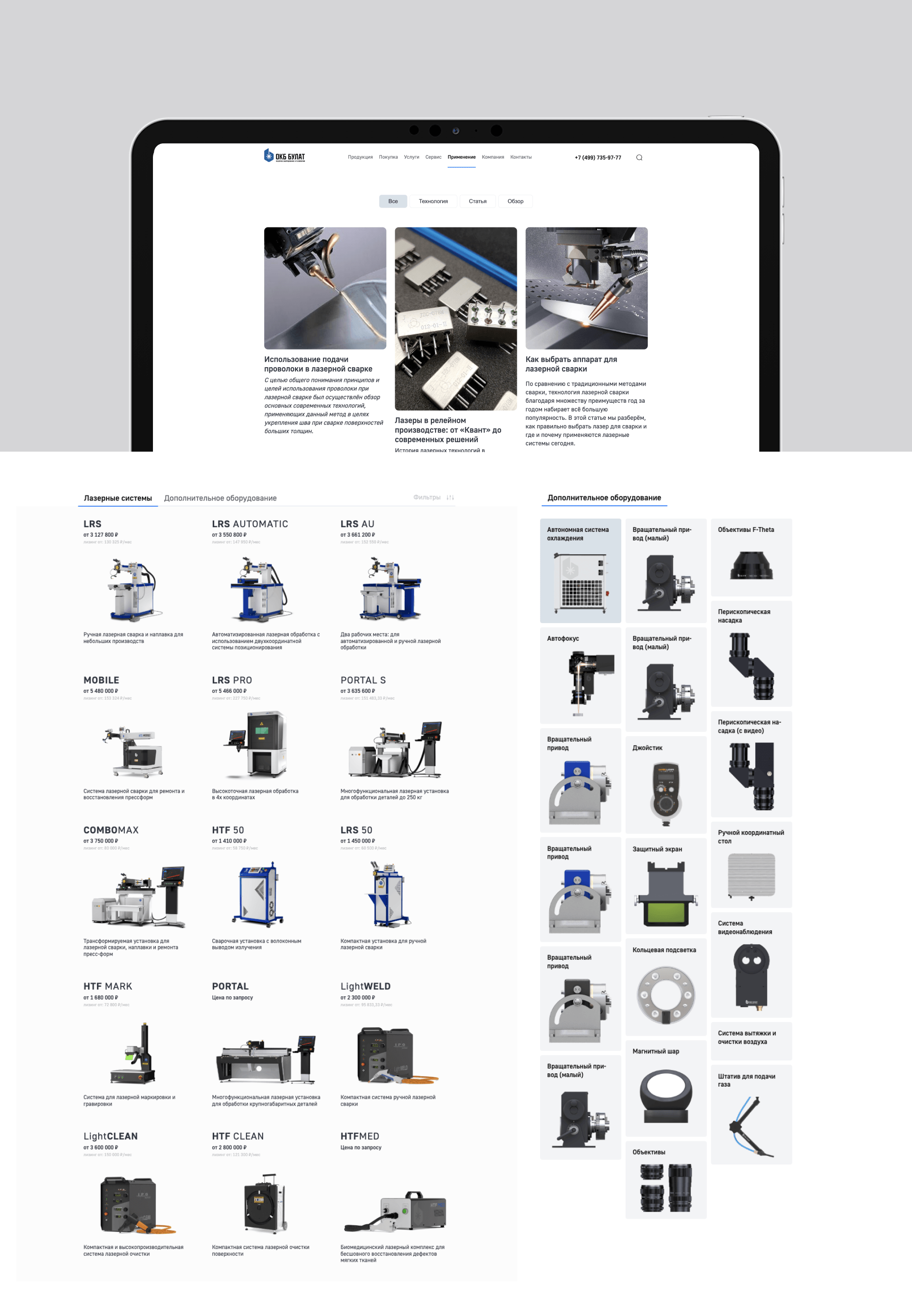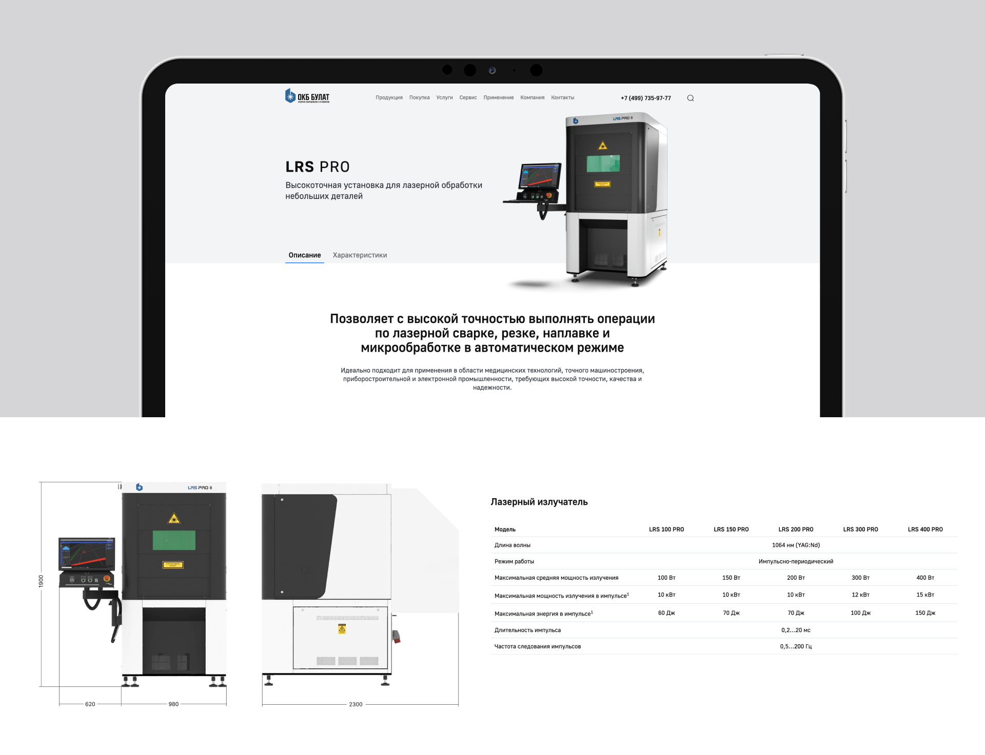 Для каждой единицы оборудования мы создали отдельный большой лендинг. На примере LRS PRO — высокоточной установки для лазерной обработки небольших деталей — видна глубина проработки. Суперсила станка — главное преимущество вынесено в заголовок. Для LRS PRO это высокая точность позиционирования (±25 мкм) и четырехосевая система для работы со сложной геометрией.