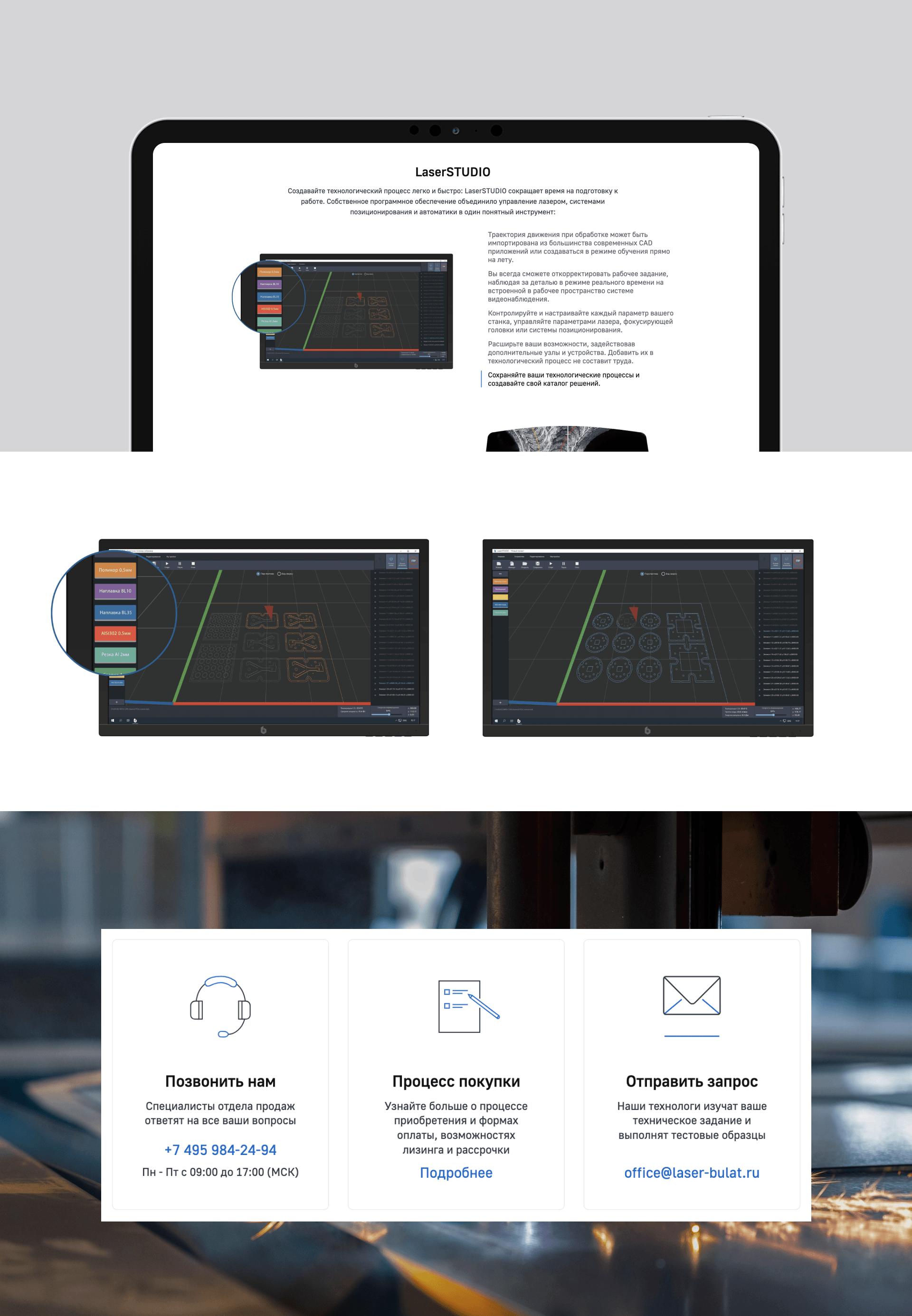 Программное обеспечение — отдельный блок про LaserSTUDIO с описанием возможностей: импорт траекторий из CAD, режим обучения, видеонаблюдение за рабочей зоной, сохранение технологических процессов.