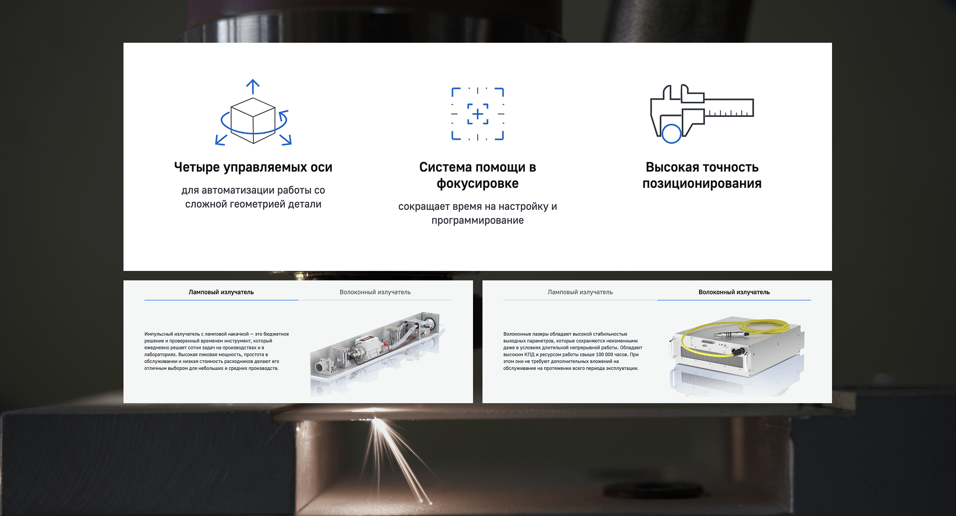 Технологические особенности — погружение в инженерные решения через визуальные элементы. Интерактивный выбор между ламповым и волоконным излучателем с объяснением преимуществ каждого. Демонстрация системы управления формой импульса с 7 преду-становленными режимами. Презентация четырехкоординатной системы позиционирования на гранитном основании.