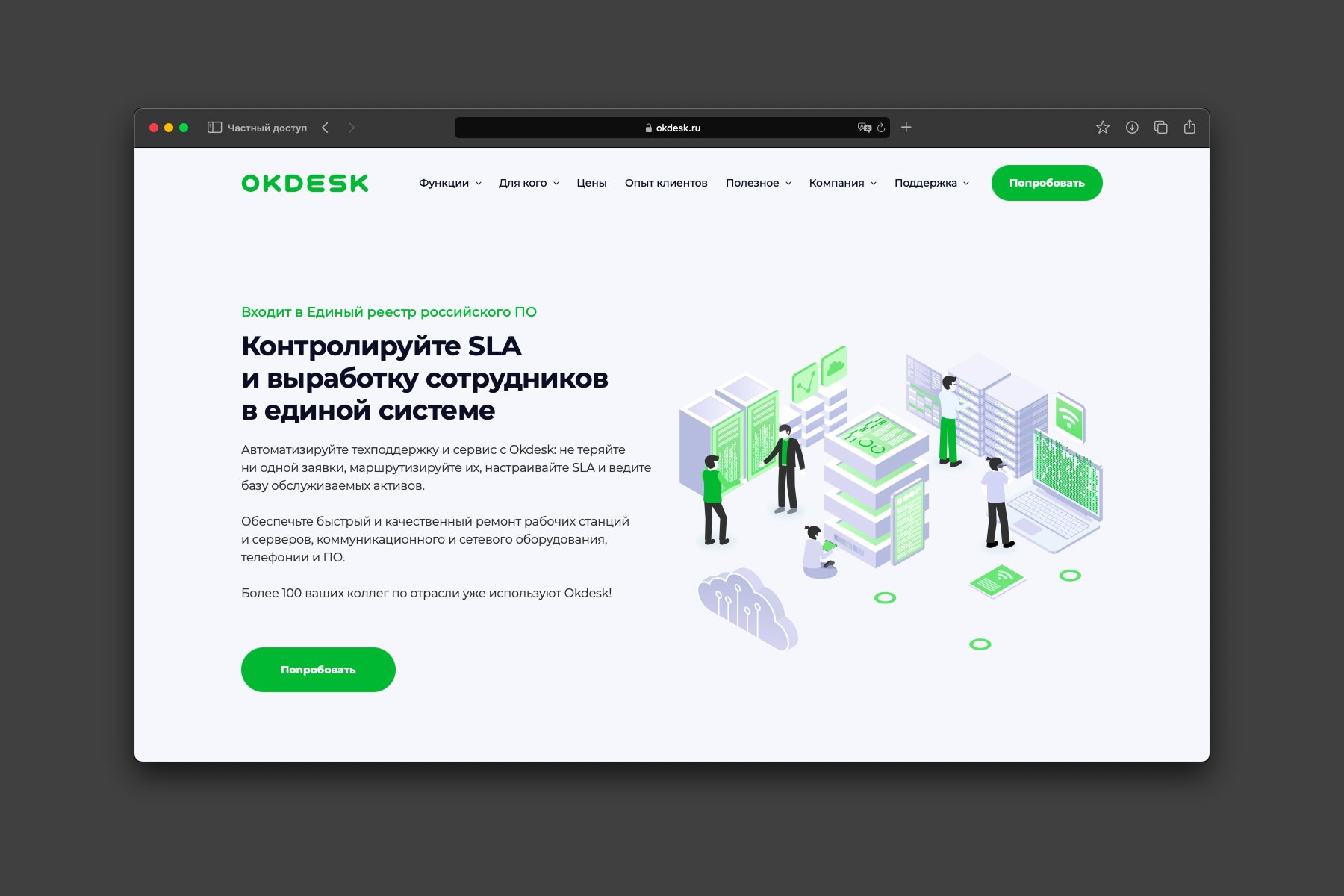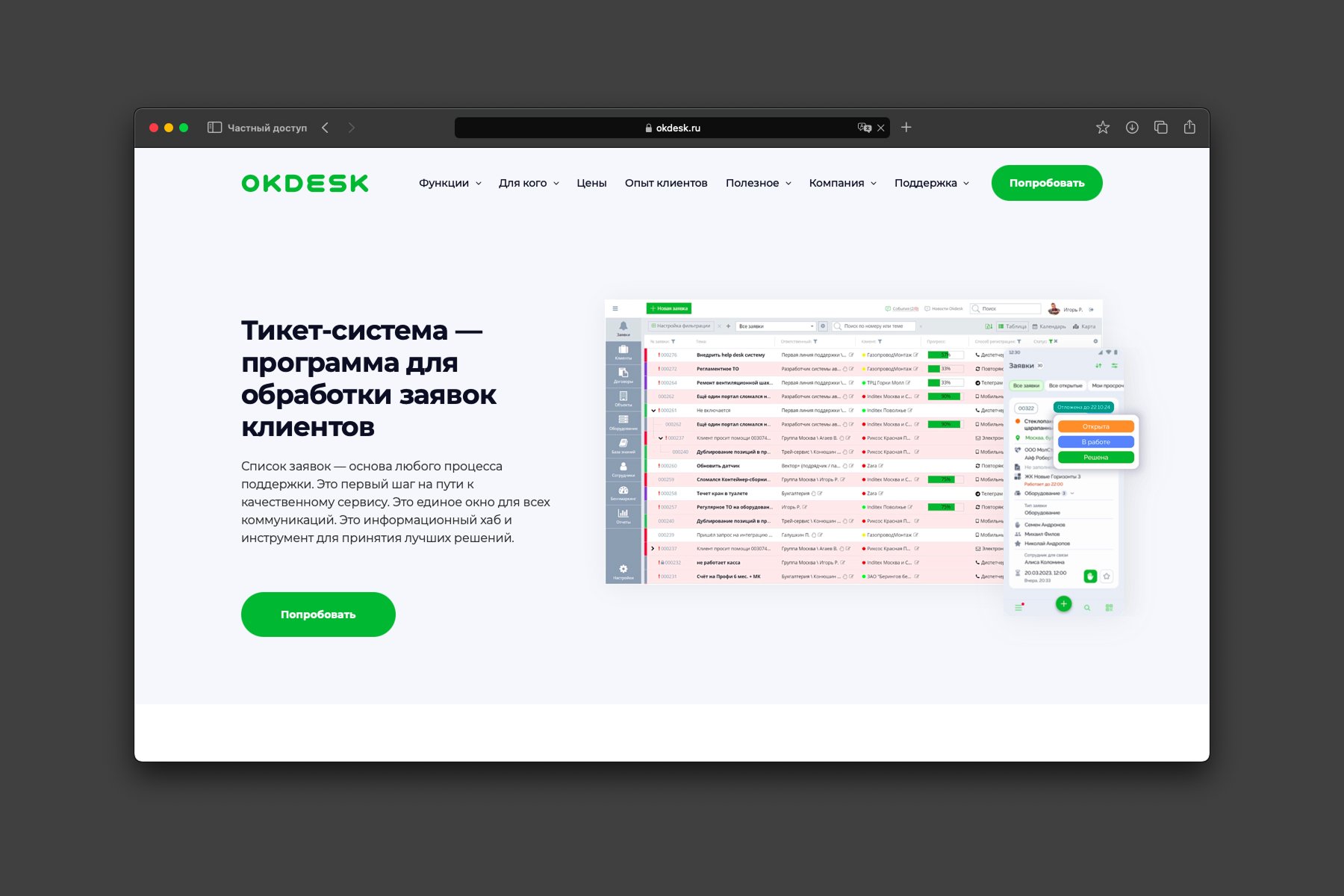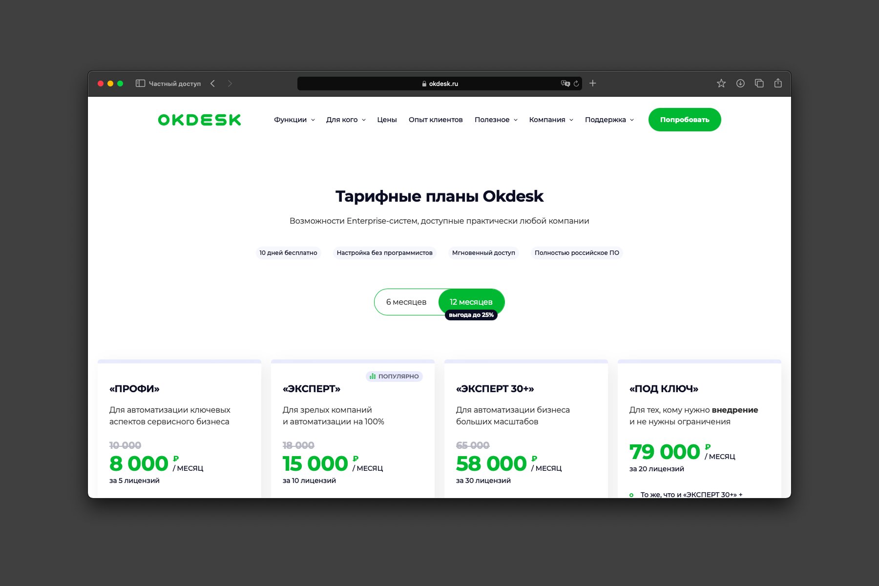 Для компании OKDESK мы разработали сайт на платформе 1С-Битрикс;