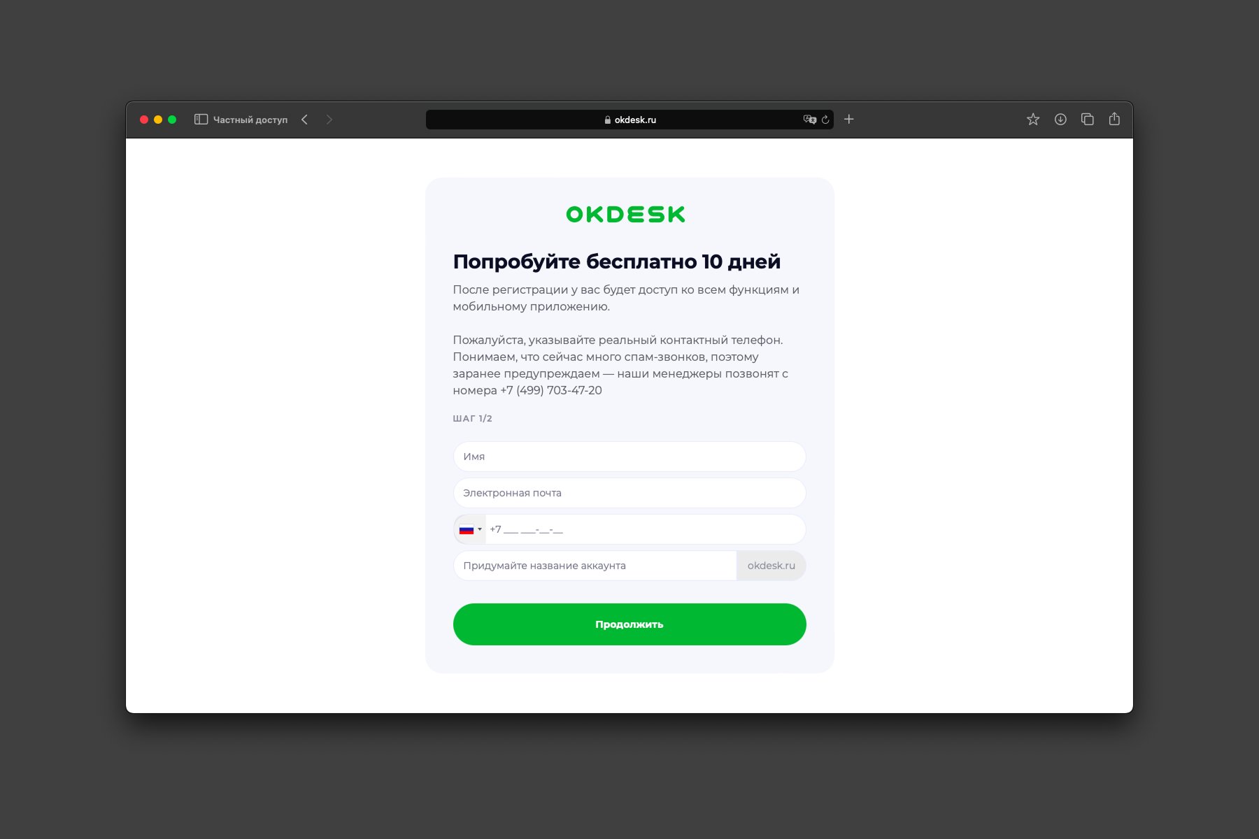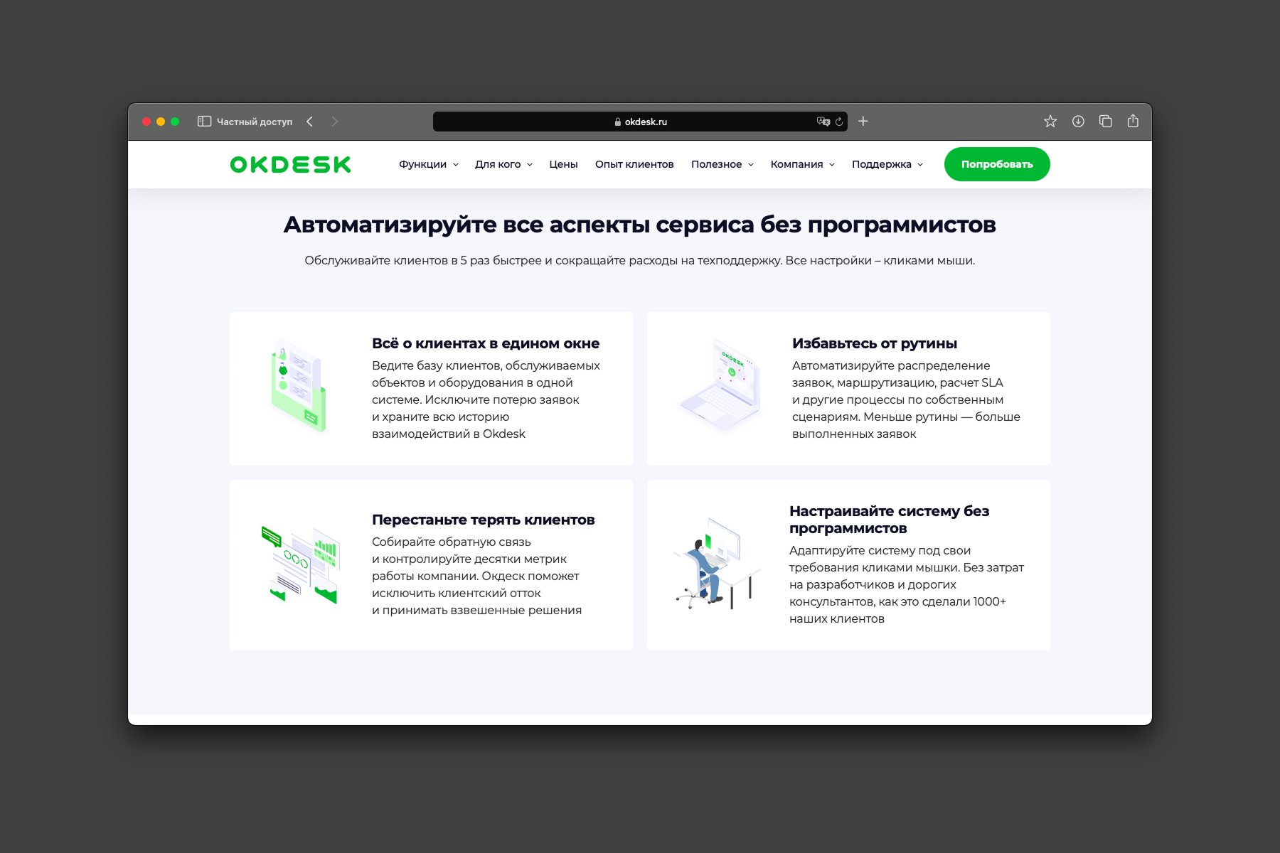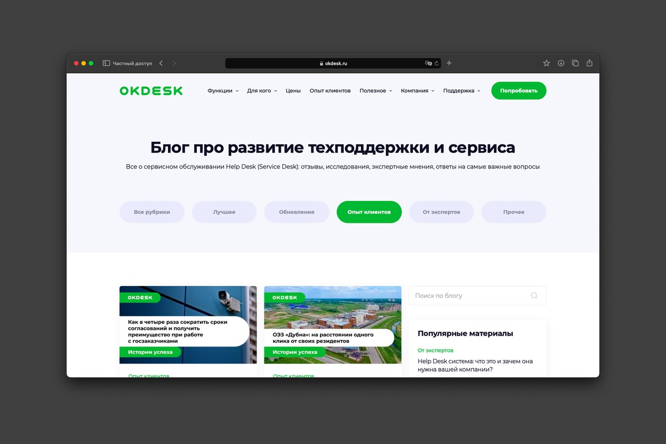 Для компании OKDESK мы разработали сайт на платформе 1С-Битрикс;