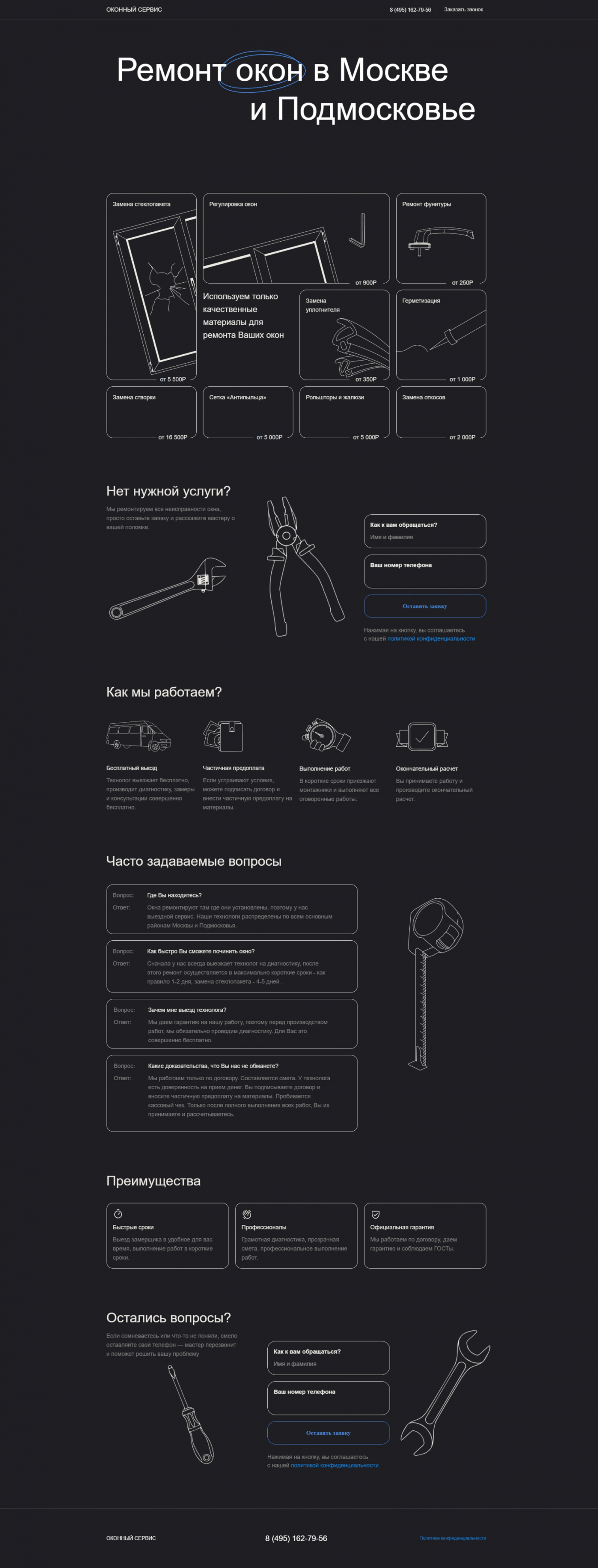 Так как большинство сайтов в оконной тематике создаются светлыми, да и у клиента уже имеется целый набор светлых сайтов и лендингов, решено было разработать один сильно отличающийся и сильно выделяющийся из общей массы. Цель была в том чтобы вообще привлечь больше внимания, чем однотипные сайты и сработать на ту часть целевой аудитории, которой нравятся тёмные сайт.