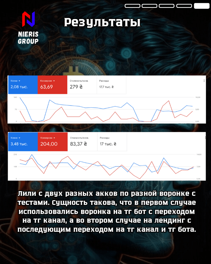 Вполне банальная и рабочая для таких дел воронка. Просто били по интересам, хотя я ещё немного схитрил в получении дешёвых лидов, да и способ могу рассказать. Просто парсишь подписчиков с криптоканалов и всё, вот тебе и результат.