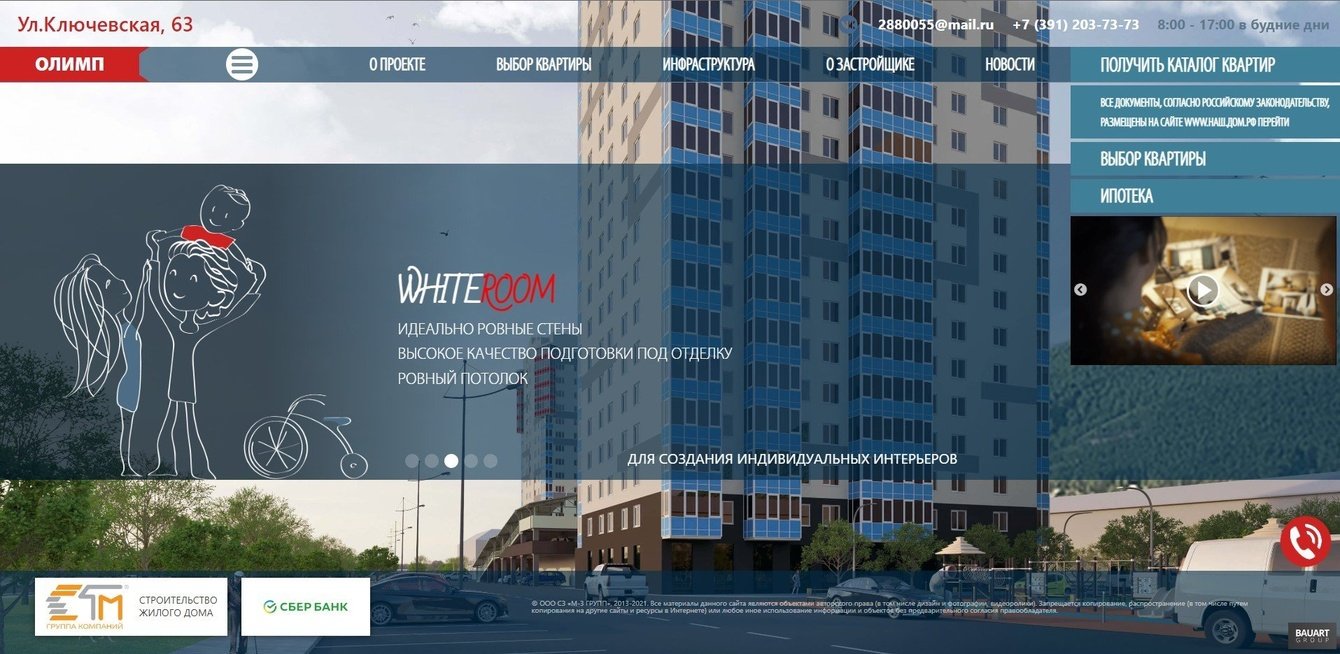 ЖК «Олимп» — жилой комплекс, состоящий из двух домов и открытой многоуровневой парковки. На сайте должно быть несколько разделов: главная с презентацией объекта, страница с выбором квартир по этажам и возможностью резерва квартиры, новости ипотеки/строительства, отчет строительства и контакты.
