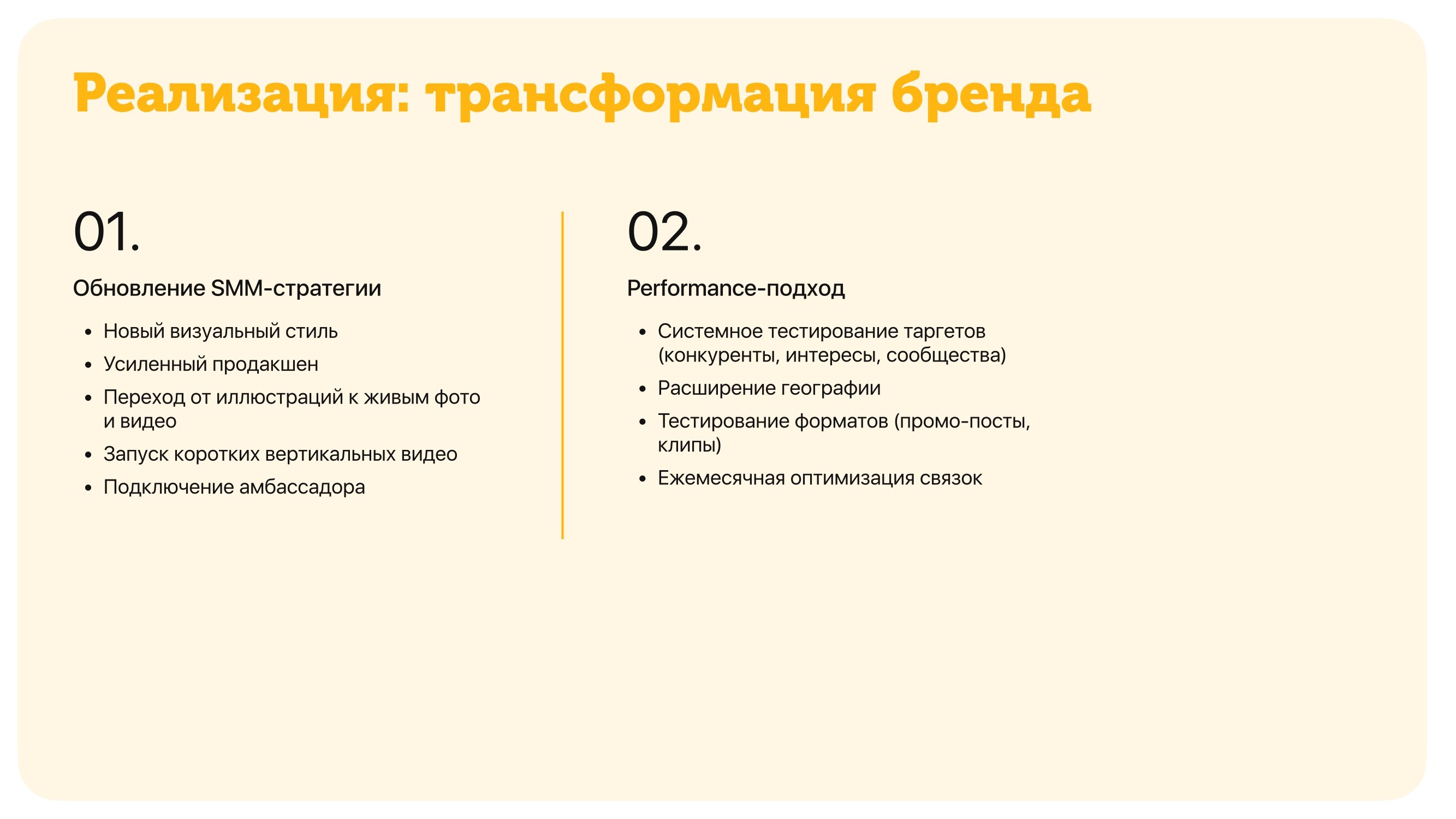 • Переход на новую SMM- и медиастратегию, основанную на данных, полученных после аудита