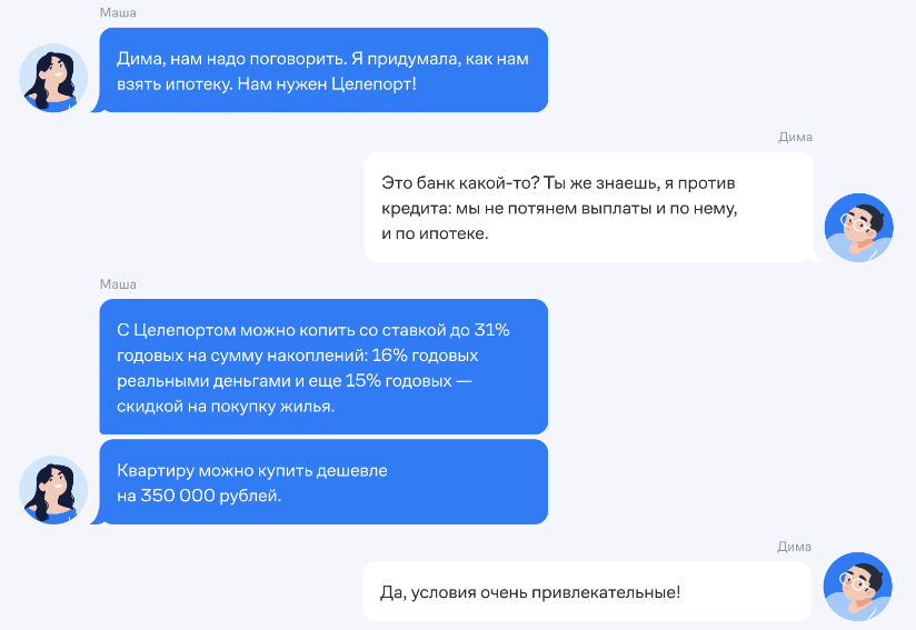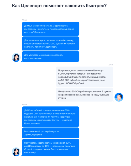 Диалоги разбиты на блоки, и в каждом из них персонажи раскрывают детали, как работает «Целепорт»: в чем экономия, почему с сервисом получится накопить быстрее, сколько Маше и Диме потребуется времени, чтобы накопить на первоначальный взнос с их стартовым капиталом, который им подарили на свадьбу.