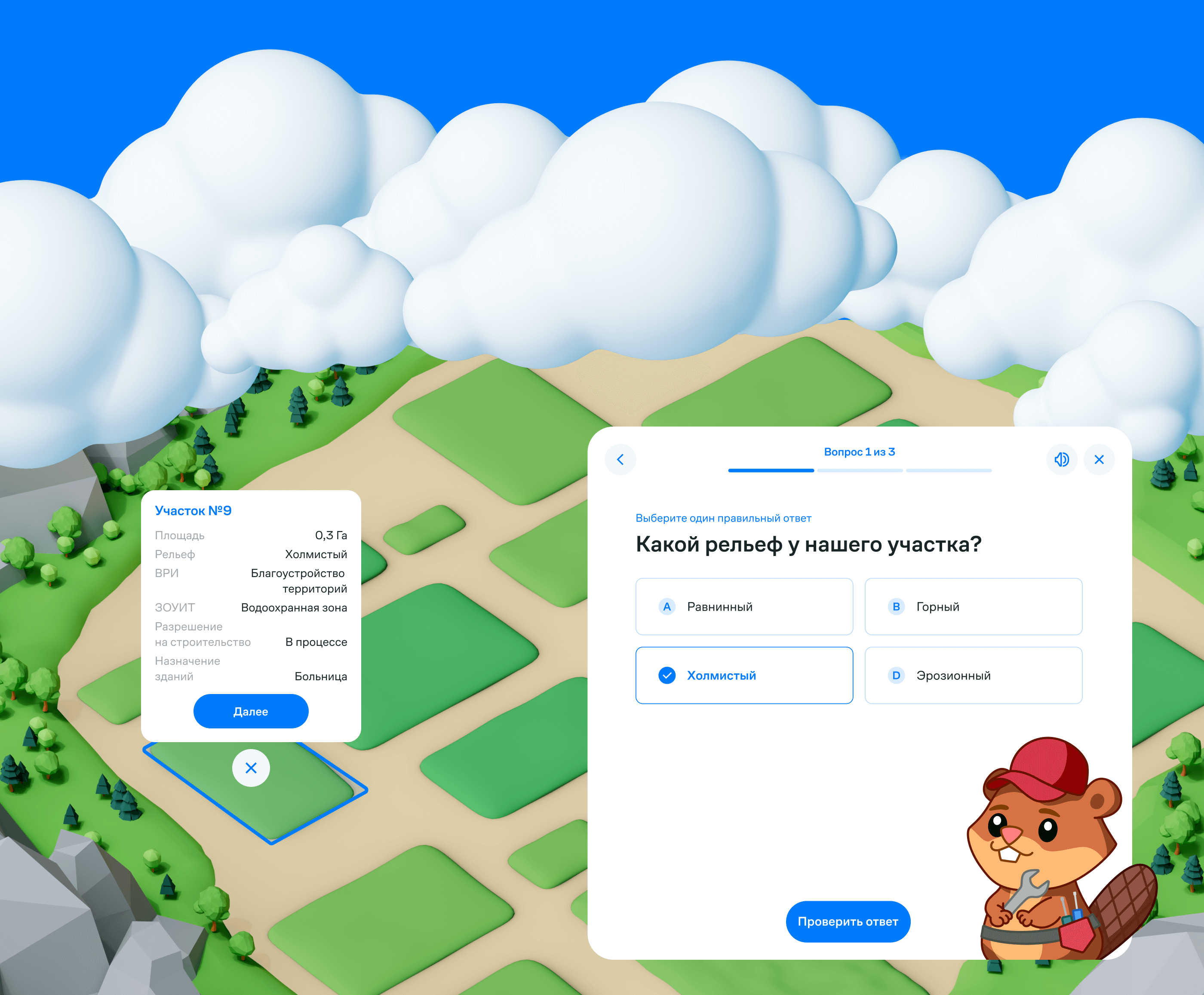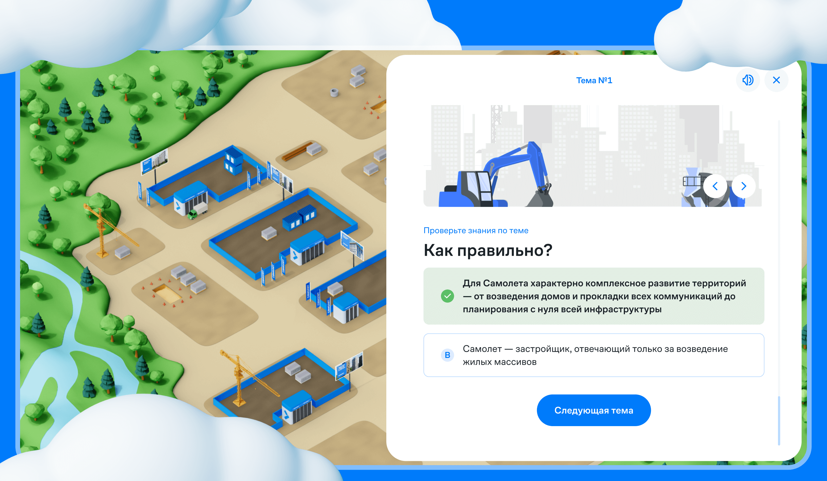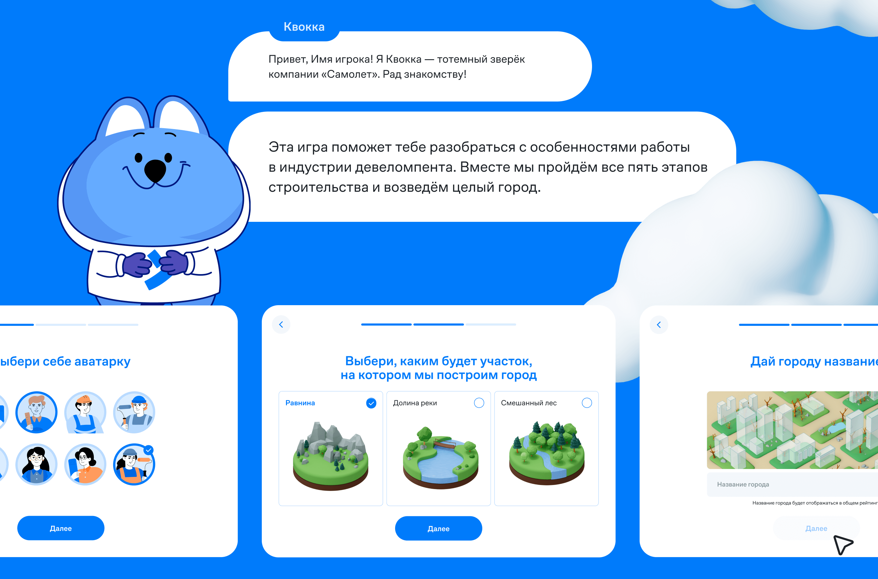 Градостроительный симулятор в стиле визуальной новеллы и обучающими механиками, в котором пользователь становится помощником руководителя проекта и вместе с тотемным зверьком «Самолета» — Квоккой, изучает процесс девелопмента с нуля