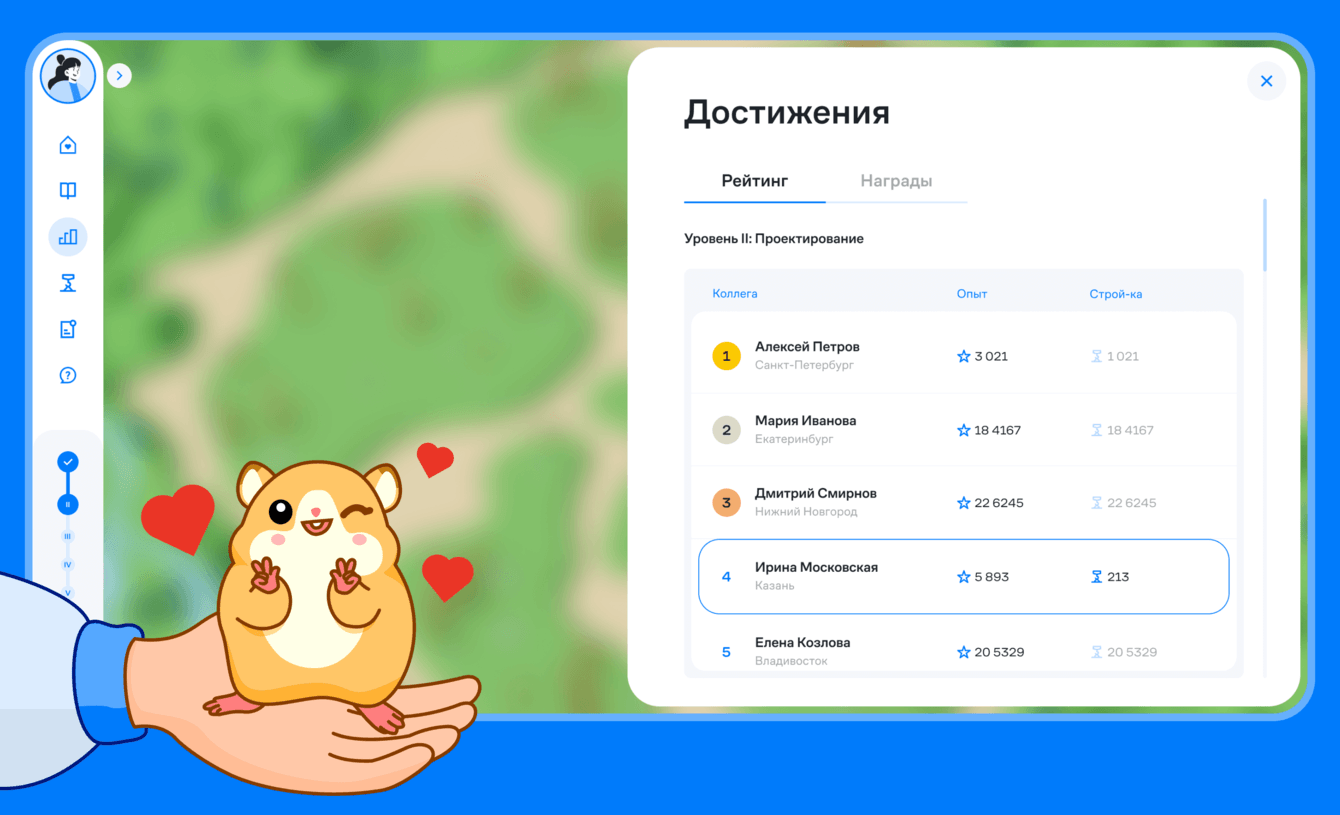 — Рейтинговая таблица и достижения. Дополнительно мотивируем сотрудников активно проходить игру
