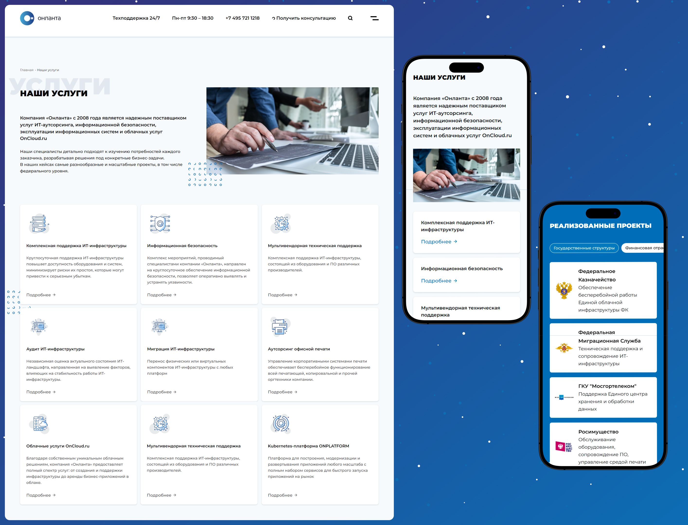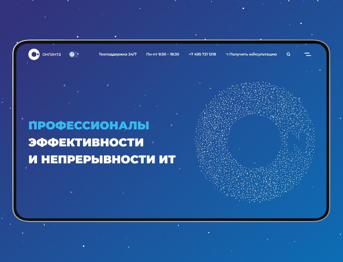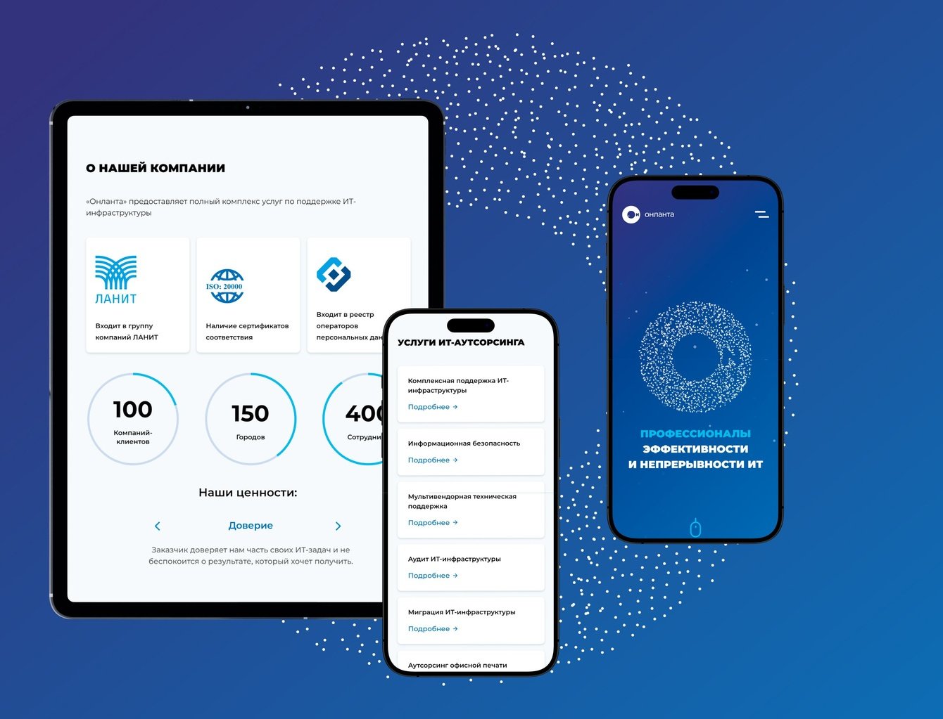 Разработать корпоративный сайт для IT-компании «Онланта», который бы представлял её как надежного и инновационного игрока на рынке IT-услуг. Сайт должен был демонстрировать expertise компании, её проекты, услуги и преимущества, а также обеспечивать удобство взаимодействия для потенциальных клиентов и партнёров.