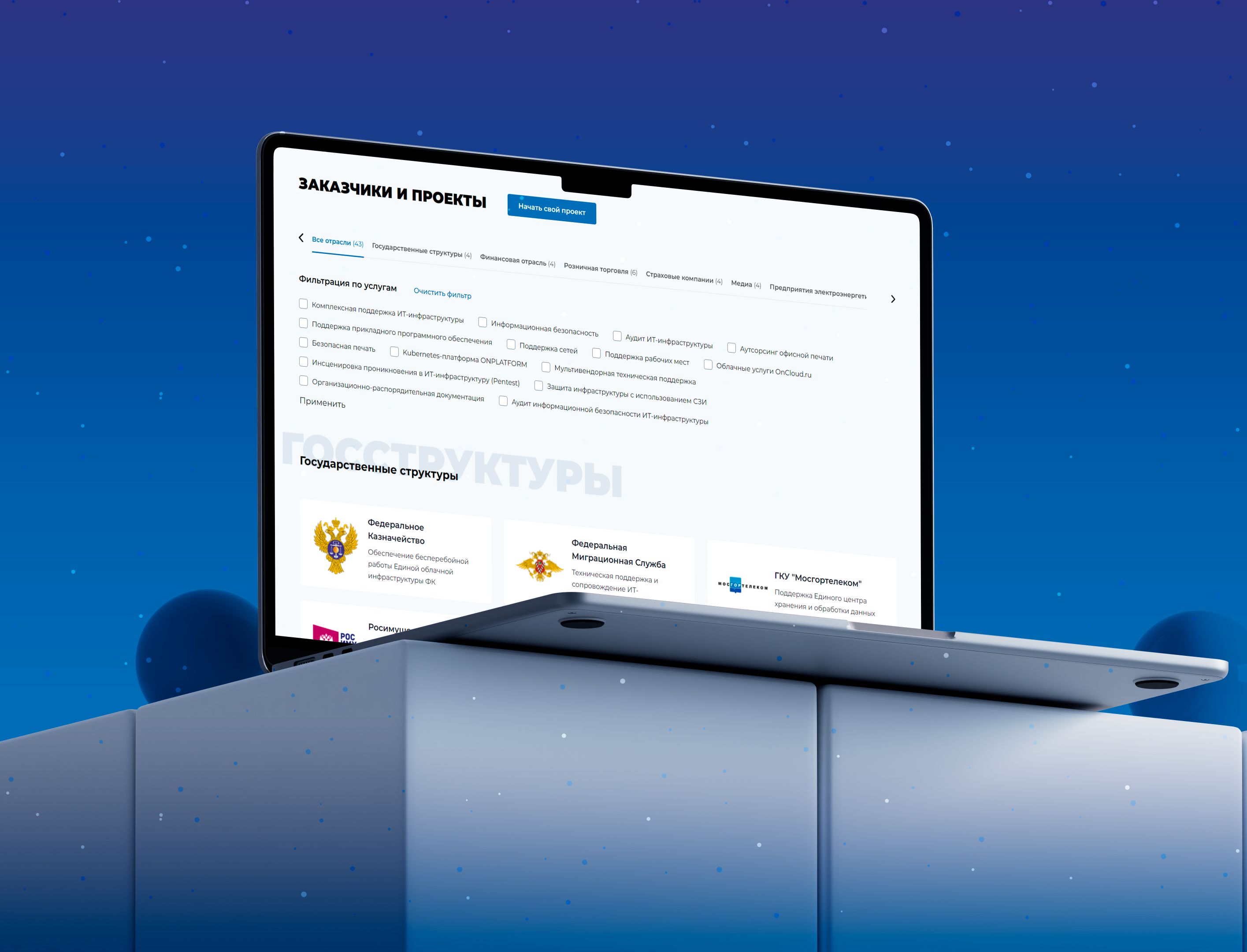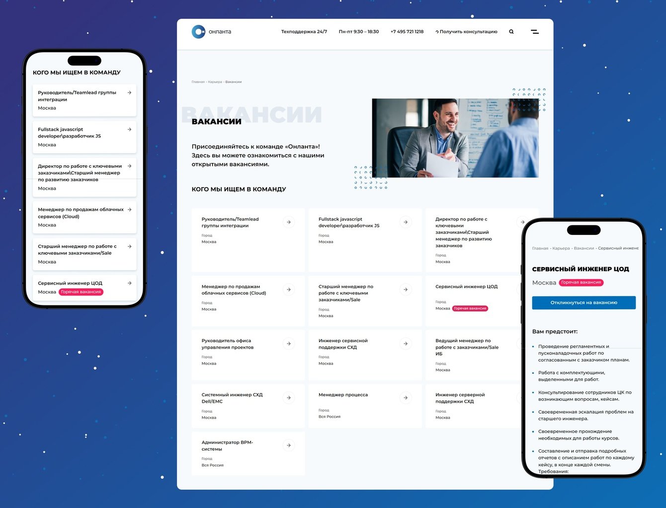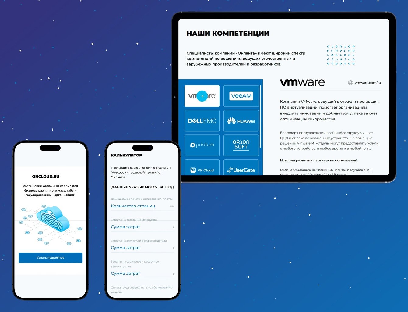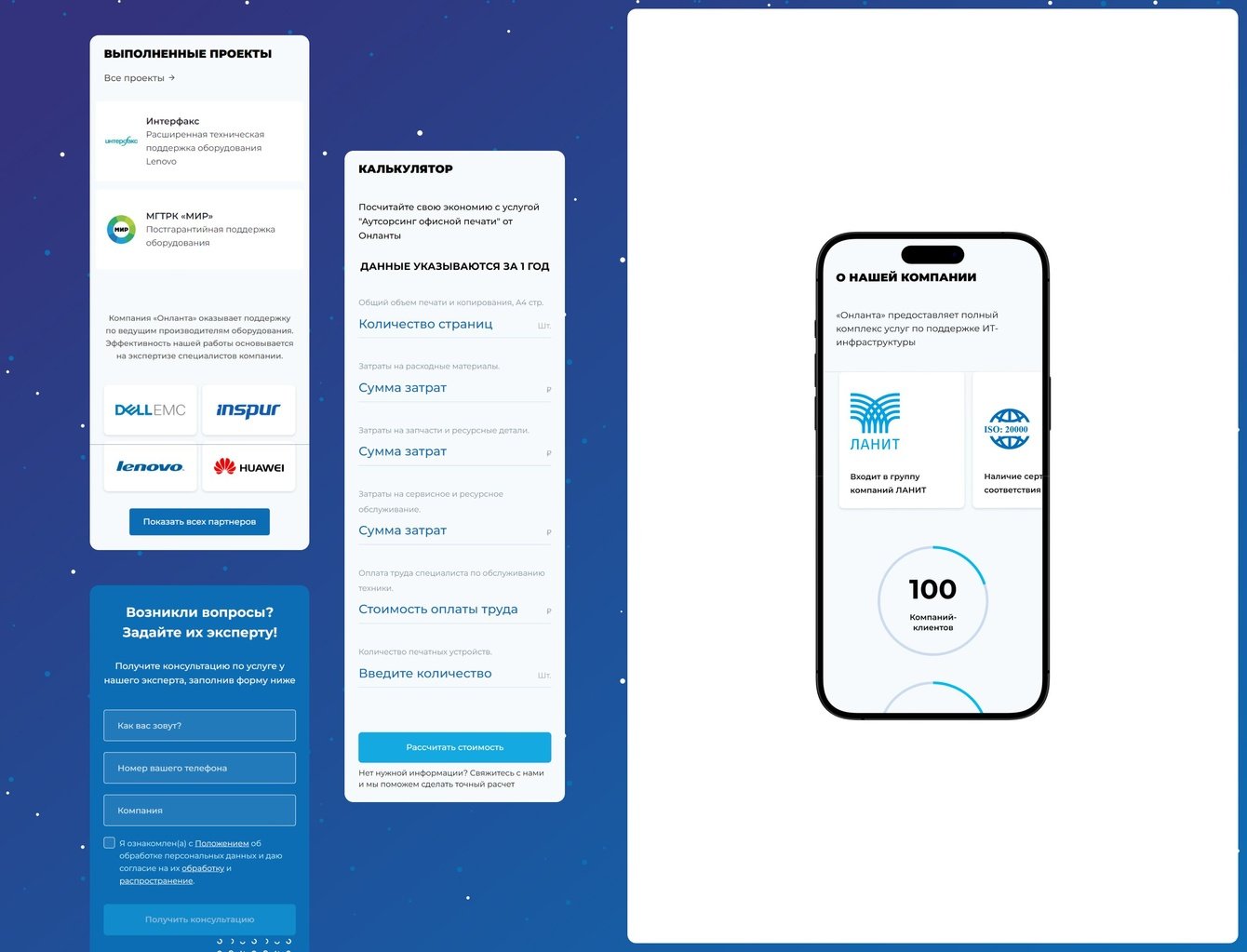Разработать корпоративный сайт для IT-компании «Онланта», который бы представлял её как надежного и инновационного игрока на рынке IT-услуг. Сайт должен был демонстрировать expertise компании, её проекты, услуги и преимущества, а также обеспечивать удобство взаимодействия для потенциальных клиентов и партнёров.