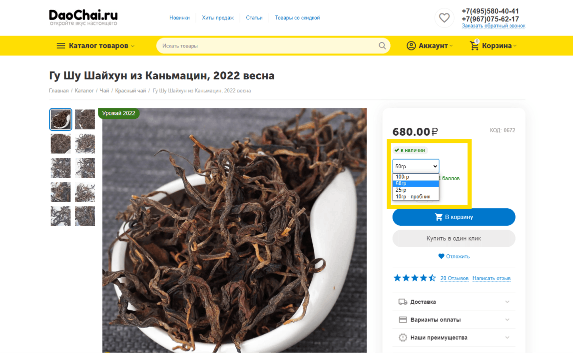 2. Добавление в корзину товаров с разными фасовками.
