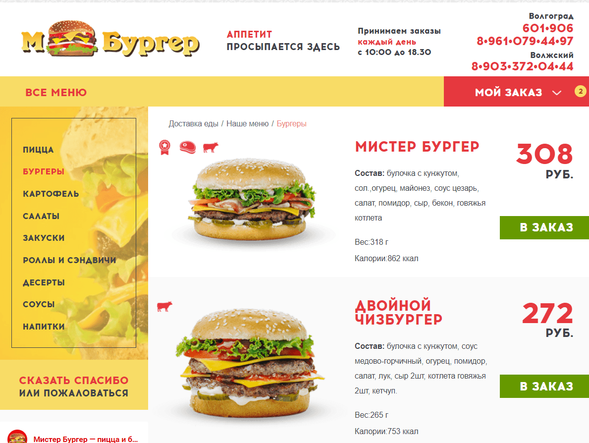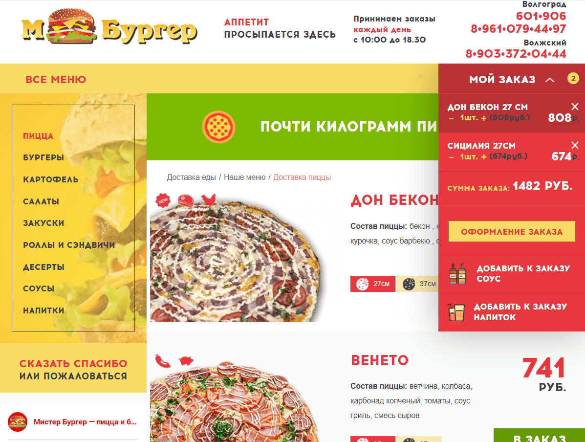 Для компании “Мистер Бургер” наше агентство разработало современный сайт доставки еды на платформе 1С-Битрикс с индивидуальным дизайном. Сайт адаптивен под любые размеры устройств от десктопа до мобильного устройства. Мы специально сделали акцент на адаптивную верстку для мобильных устройств, так как большинство пользователей используют свой мобильный телефон для заказа. Реализовали удобное меню где можно посмотреть как выглядит продукт, его ингредиенты, а по иконкам сразу понять из чего состоит продукт. Это очень удобно если есть предпочтения или ограничения в еде. Каждый продукт имеет подробное описание и визуальное отображение. Так как это сайт доставки еды мы предусмотрели зонирование стоимости доставки на карте и удобную корзину.