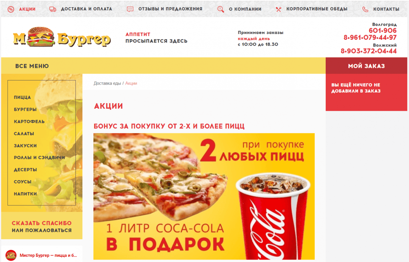 Перед нами стояла задача создать адаптивный сайт доставки еды, с удобным для пользователя интерфейсом заказа, на платформе 1С-Битрикс. Сайт должен отображать максимальное количество информации, полезной для покупателя, удобное меню с визуальным отображением продукции компании. Корзину заказов в которой пользователь сможет легко изменять заказ, добавлять, удалять продукцию. Легко открываться на мобильных устройствах.