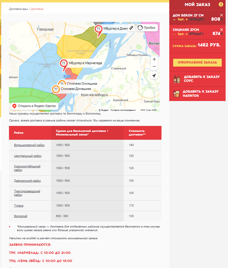 Компания “Мистер Бургер” имеет несколько точек в двух соседних городах. Для удобства пользователей, на карте мы поделили разными цветами зоны доставки. Каждый цвет отвечает за определенную зону доставки с индивидуальной стоимостью и условиями и сроками доставки. Данное решение помогает пользователям понимать точную стоимость доставки, когда будет заказ, и необходимую сумму заказа для бесплатной доставки.