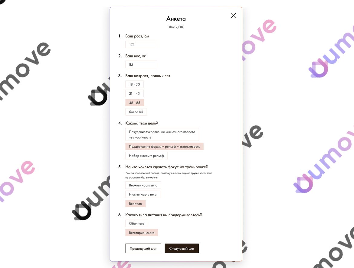 Для составления программы тренировок пользователь проходит анкетирование своих данных и целей - по этим результатам определяется программа тренировок